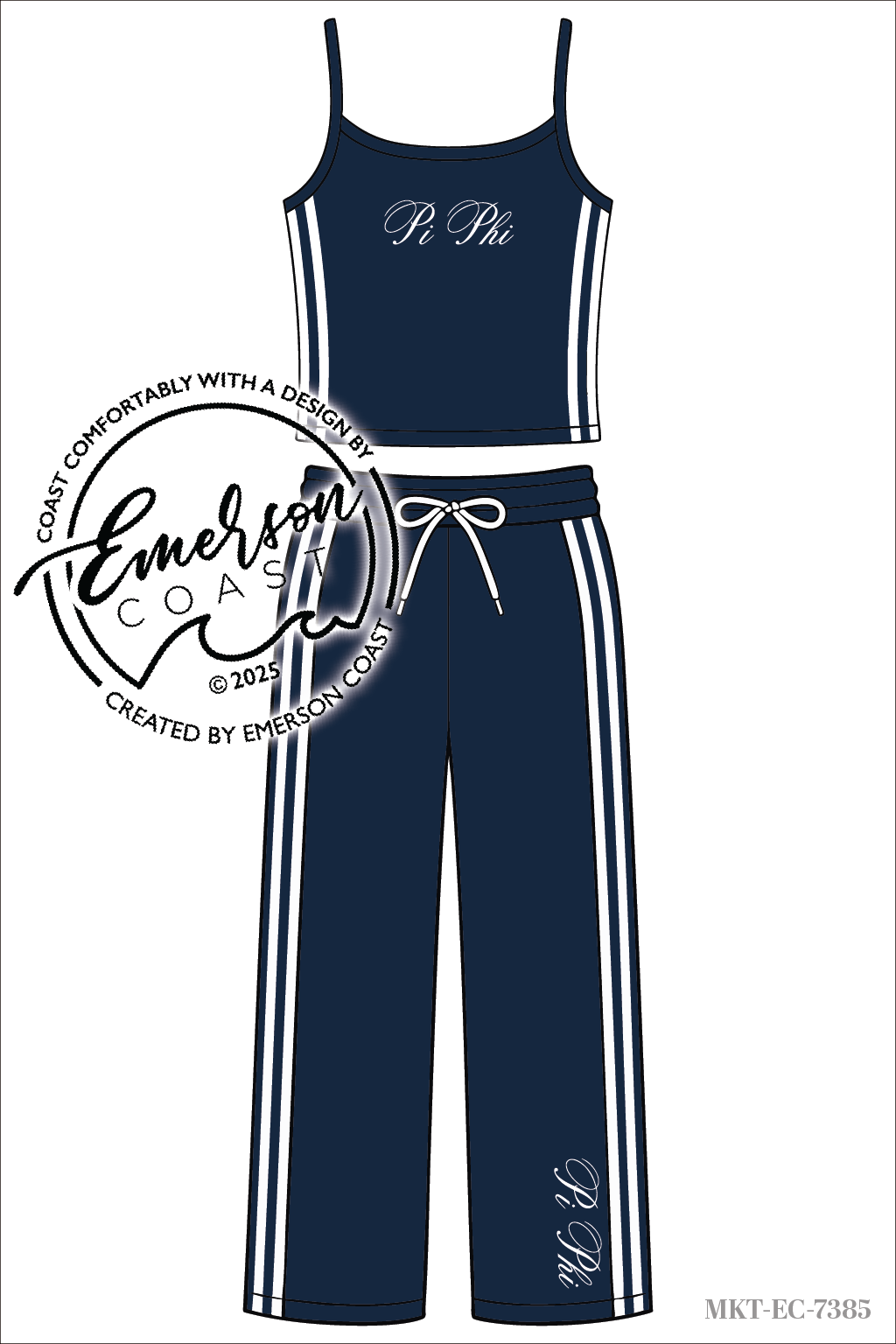 The tank features Pi Phi in elegant script across the chest, while the matching pants glide to a sleek silhouette with double white stripes down the sides.