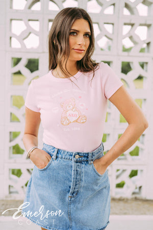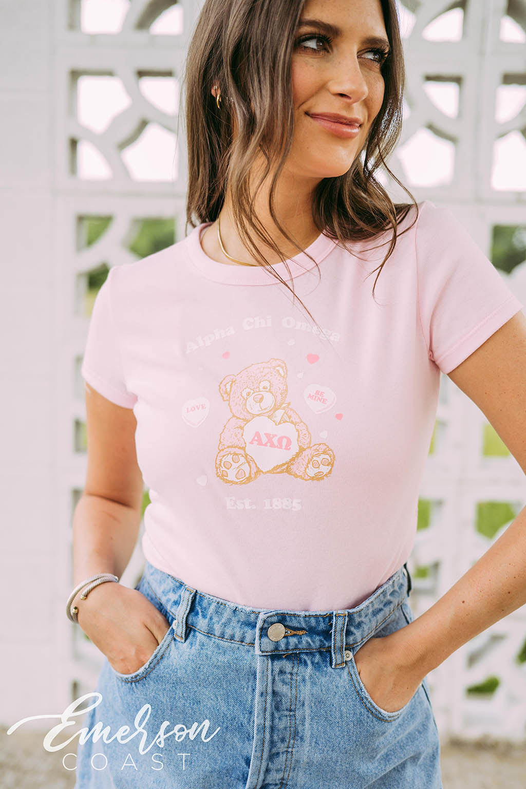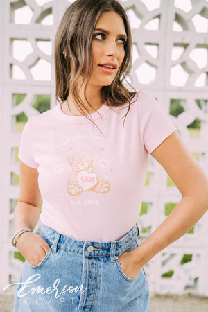 Get ready to look cuter than ever this season with the Alpha Chi Omega Bear Baby Tee! This super-soft and comfortable baby tee is perfect for spring or summer and can match whatever style you are going for! Whether you're looking for a dressed up, comfy casual look, or just want to add a fun pop of colorto your go-to denim shorts and platform sneakers, this tank is the perfect versatile piece that will look great with everything!