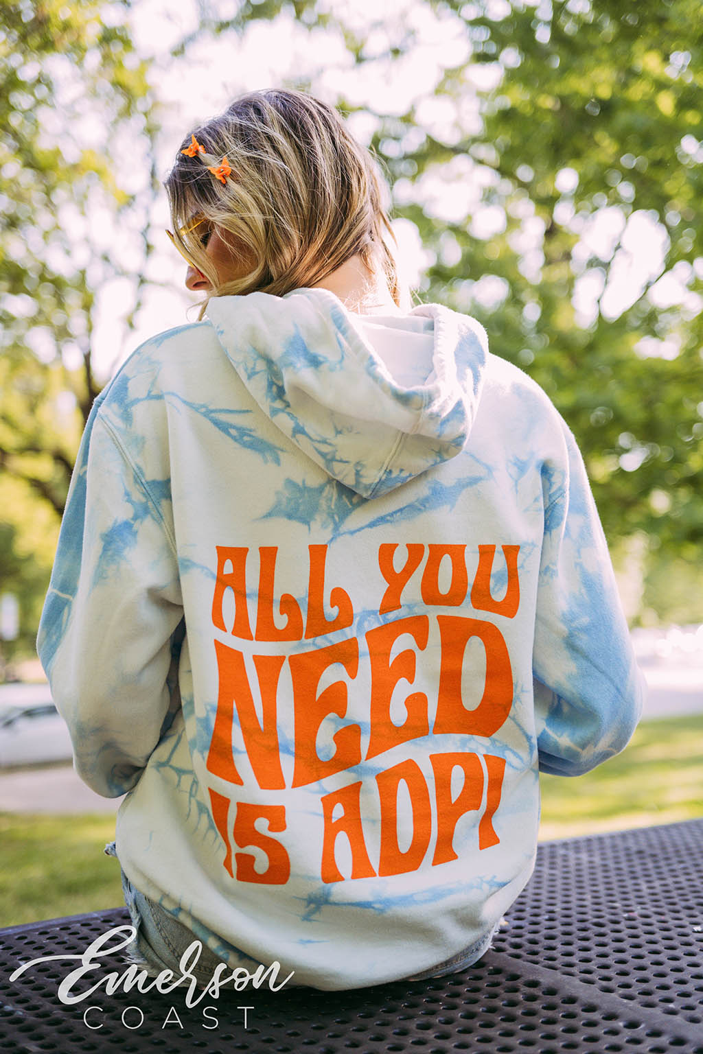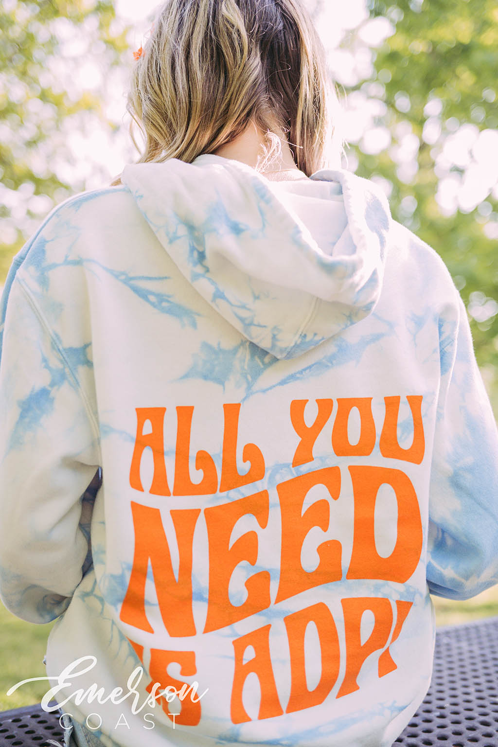 The groovy font adds a trendy 70s look to this cloudy hoodie.
