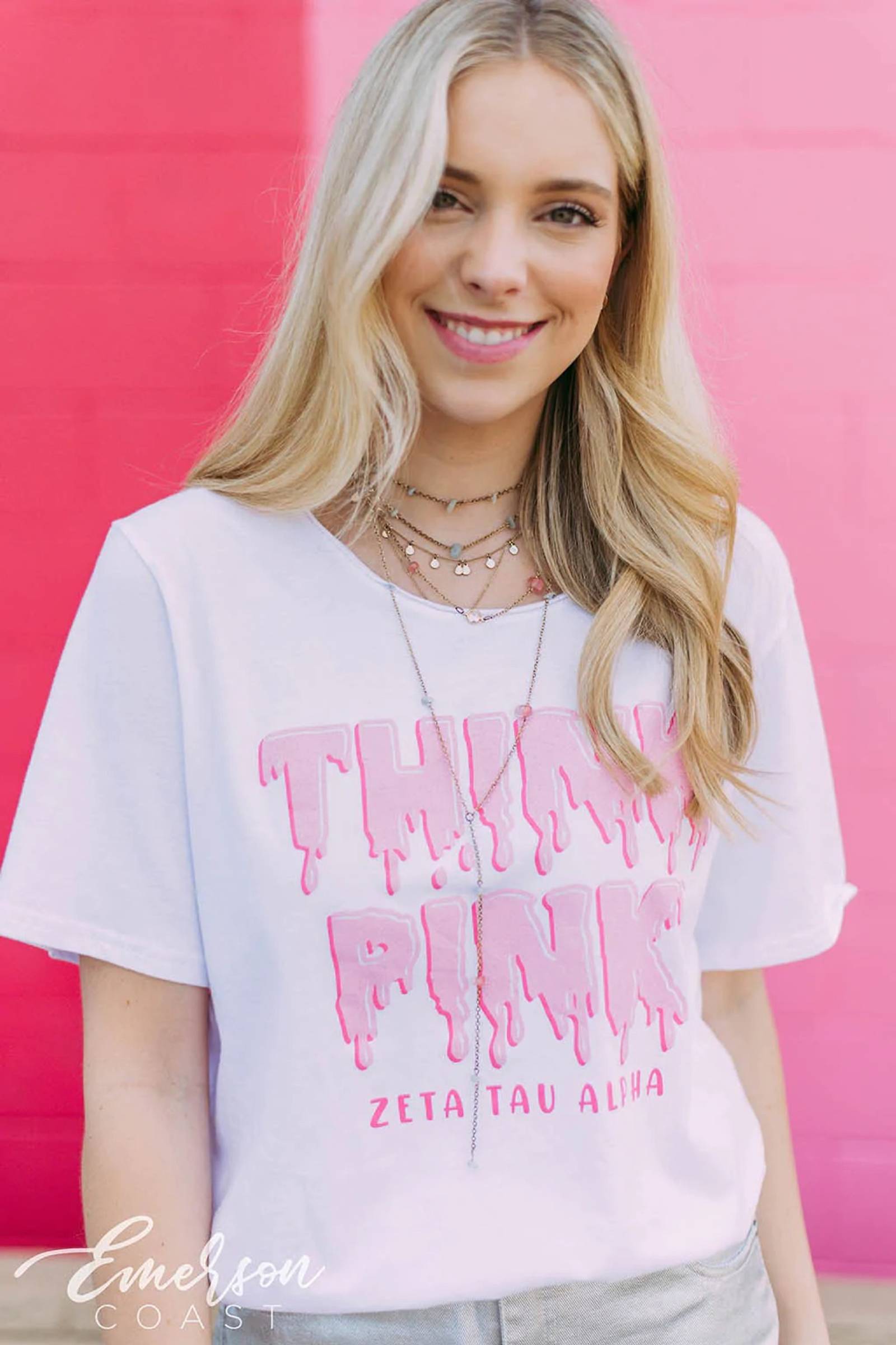 Shine bright in the Alpha Gamma Delta Philanthropy Raw Neck Tee!