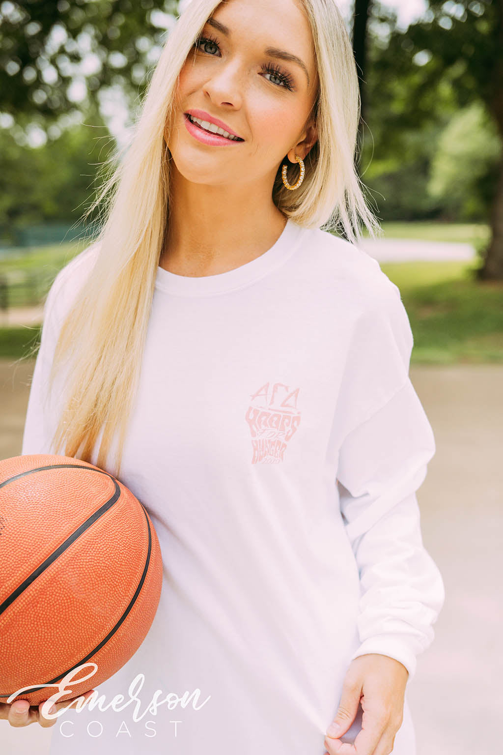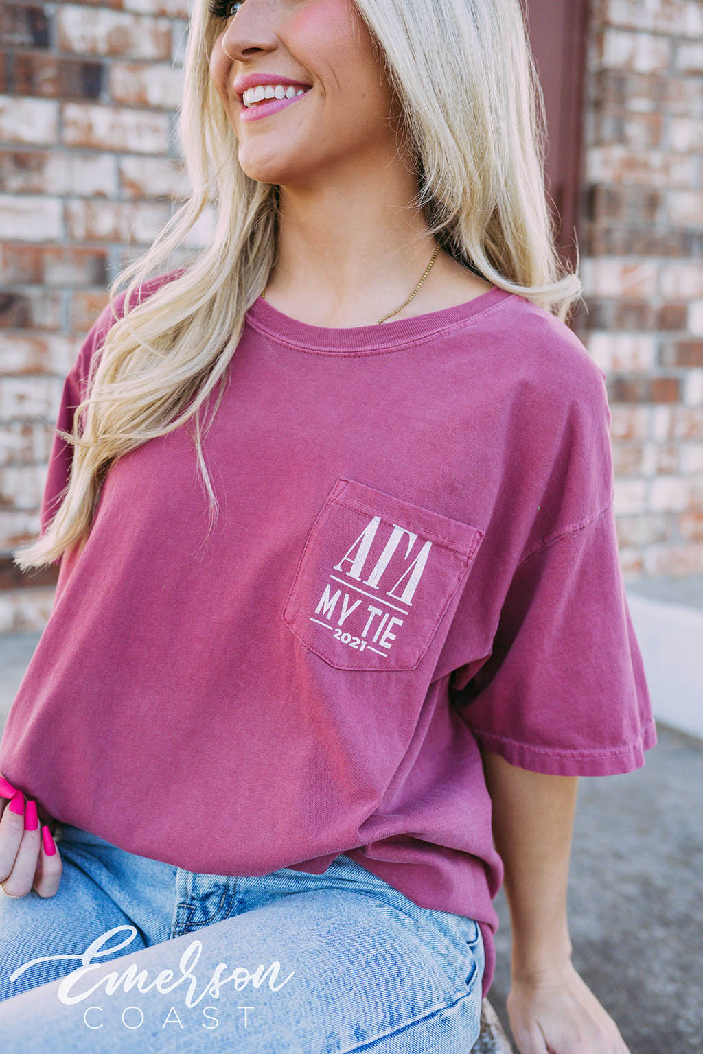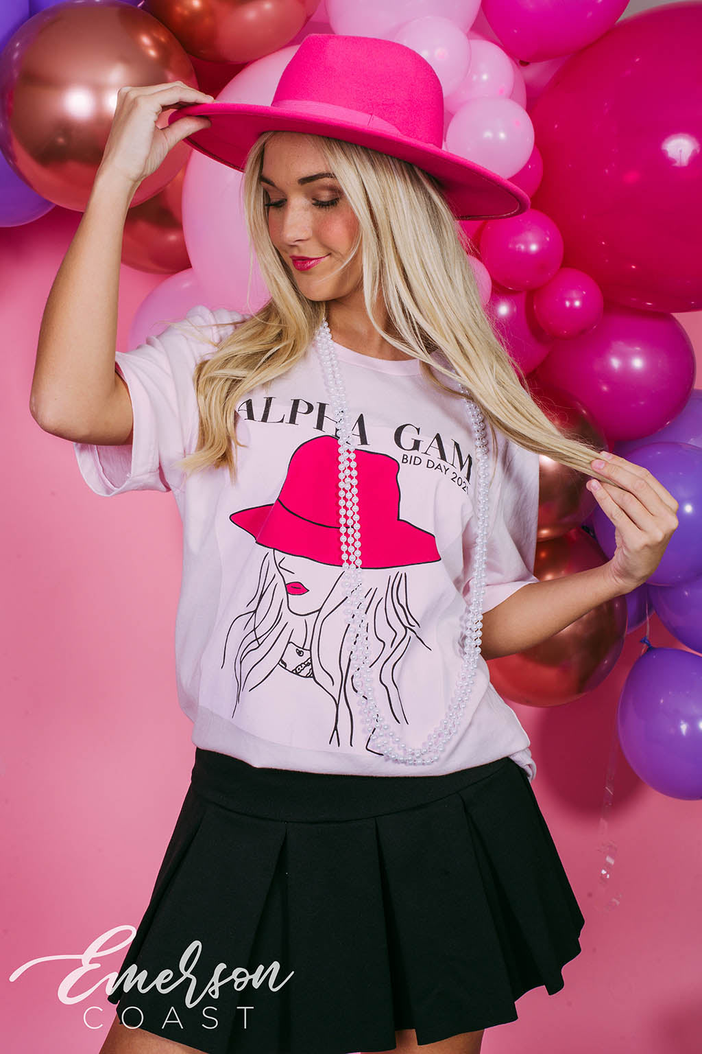 Gamma Phi at Oklahoma State floated into Bid Day with the dreamiest hot air balloon theme and the cutest pink colorblock ringer tees! Featuring soft pastel Greek letters, these tops added a fun pop of retro charm to an already magical day.
