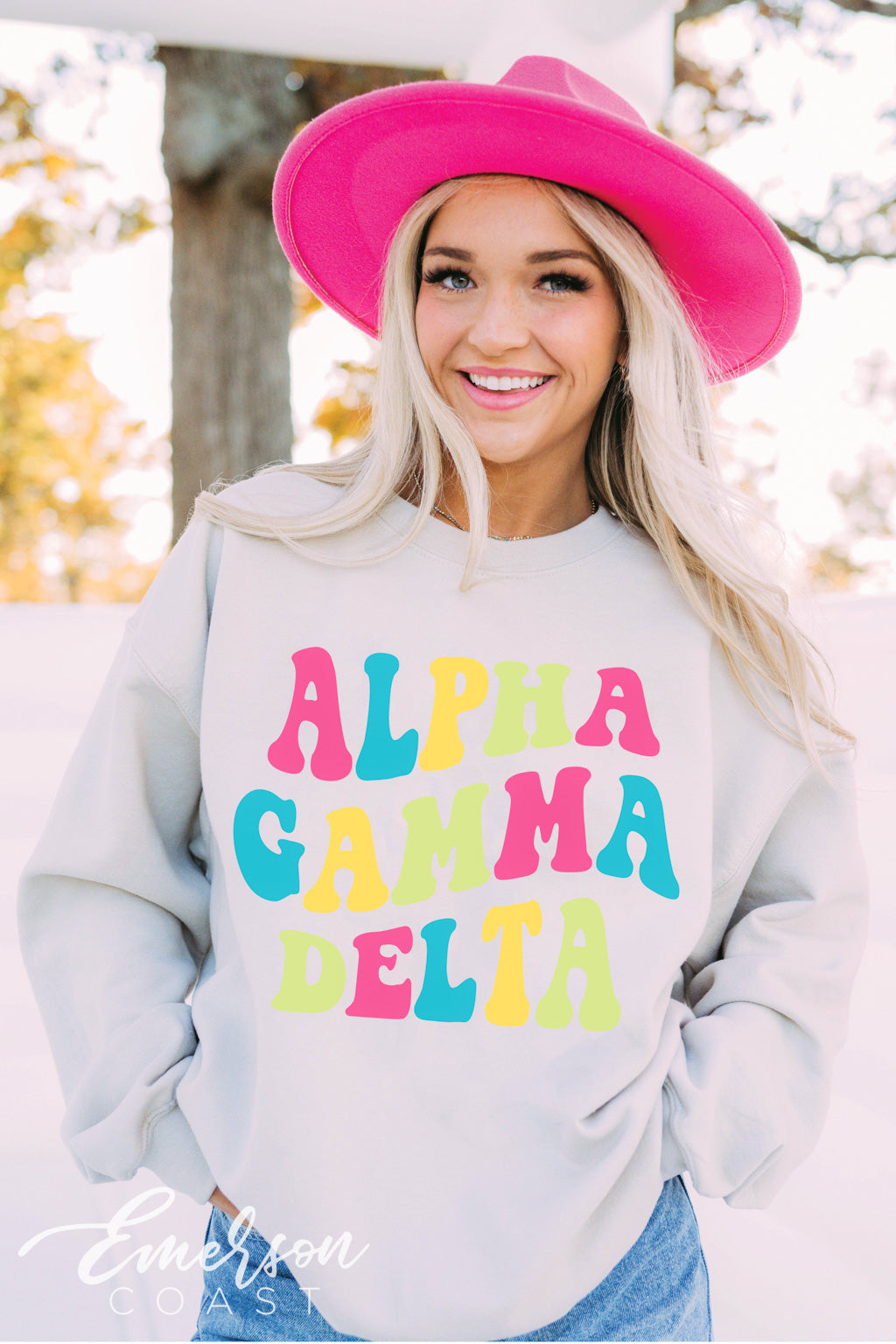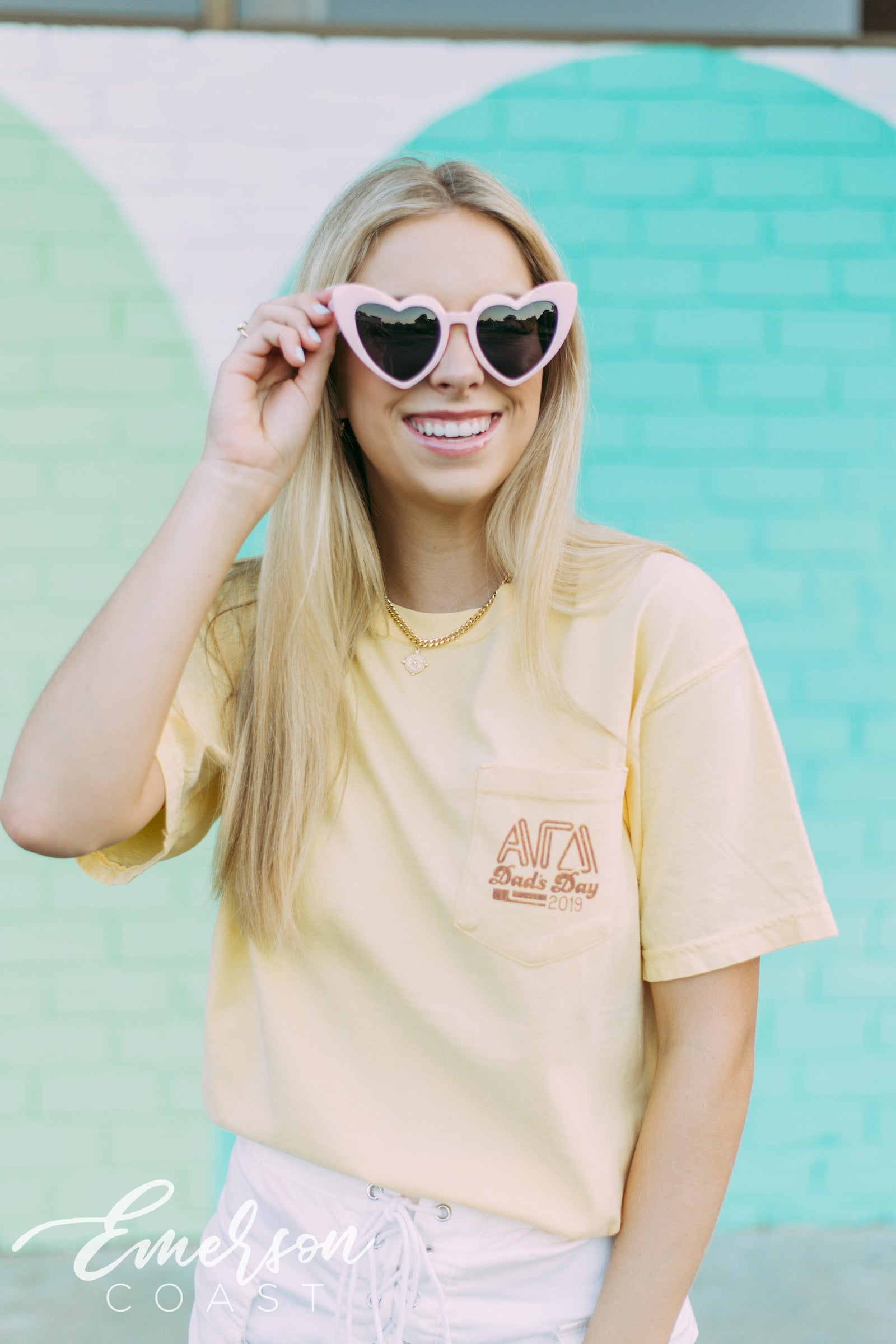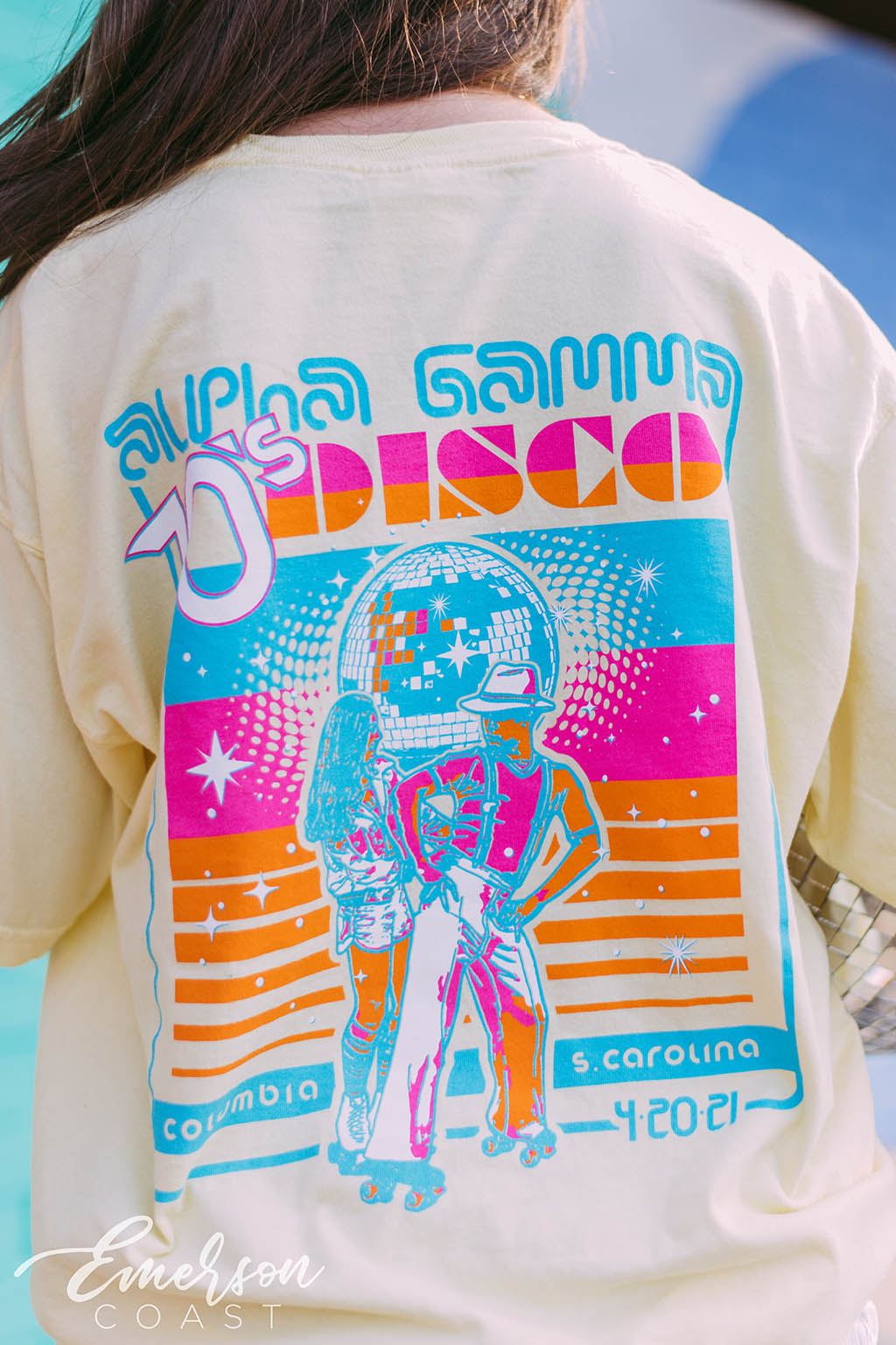 Gamma Phi at Oklahoma State floated into Bid Day with the dreamiest hot air balloon theme and the cutest pink colorblock ringer tees! Featuring soft pastel Greek letters, these tops added a fun pop of retro charm to an already magical day.