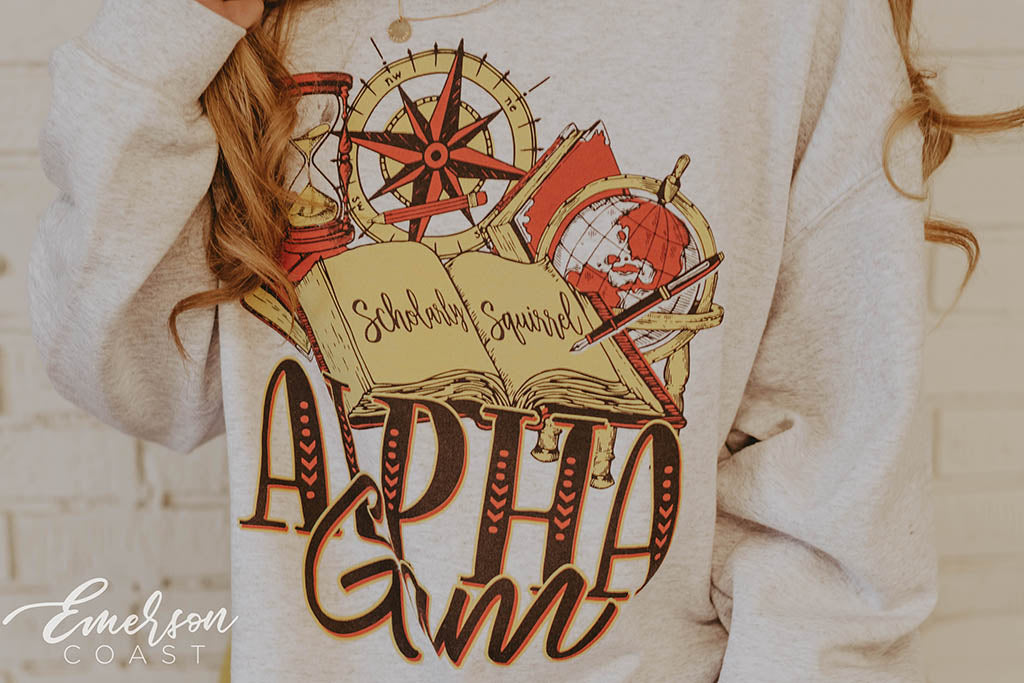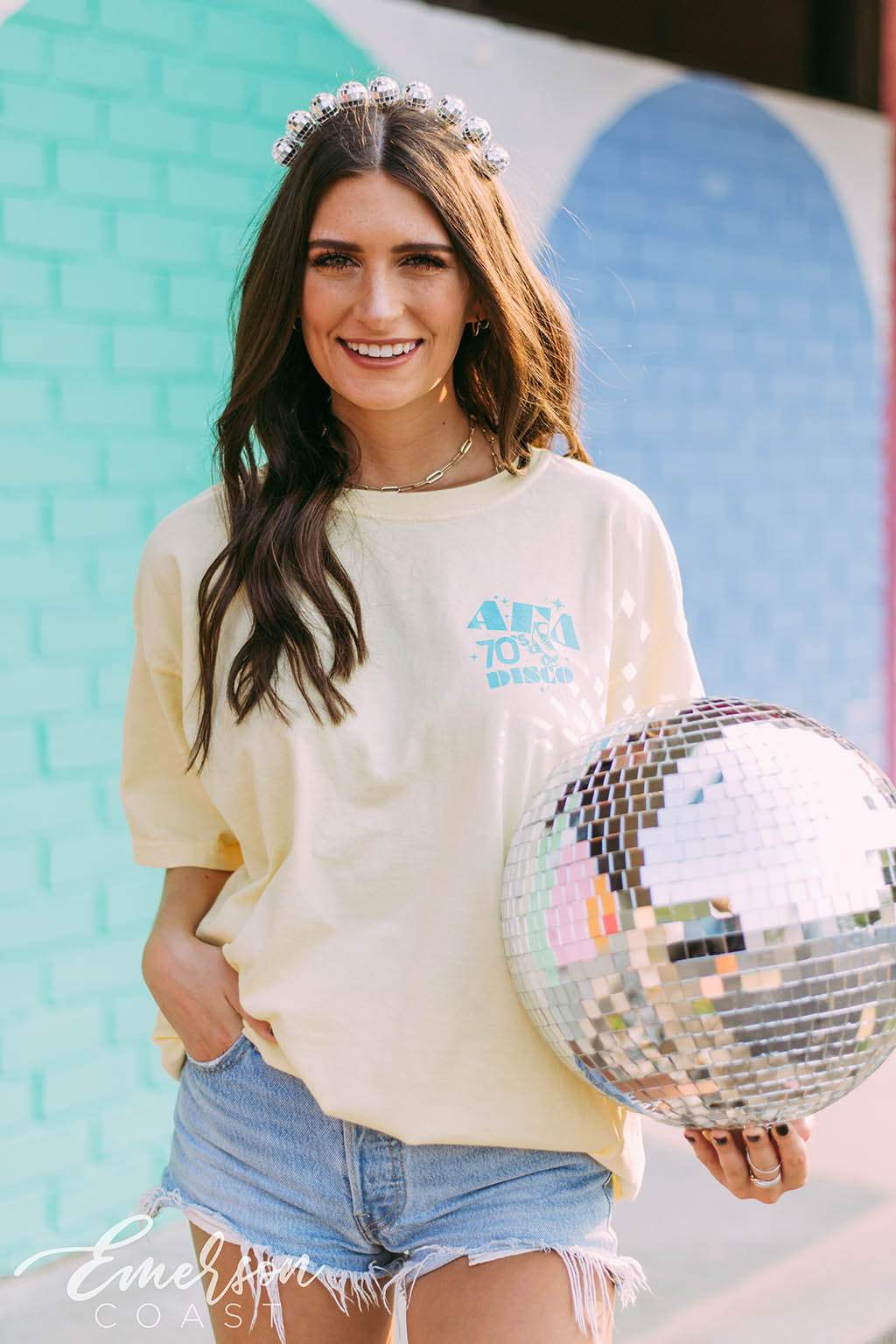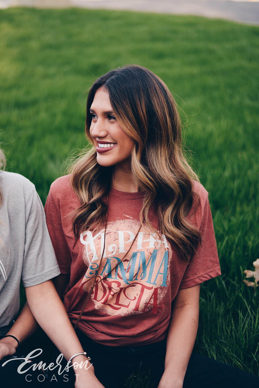 Tri Delta at Arkansas captured the magic of the Amalfi Coast for Bid Day with custom slouchy tees — white for members, cloud blue for new girls. Styled with flowy skirts and neck scarves, the whole vibe was straight out of a summer postcard.