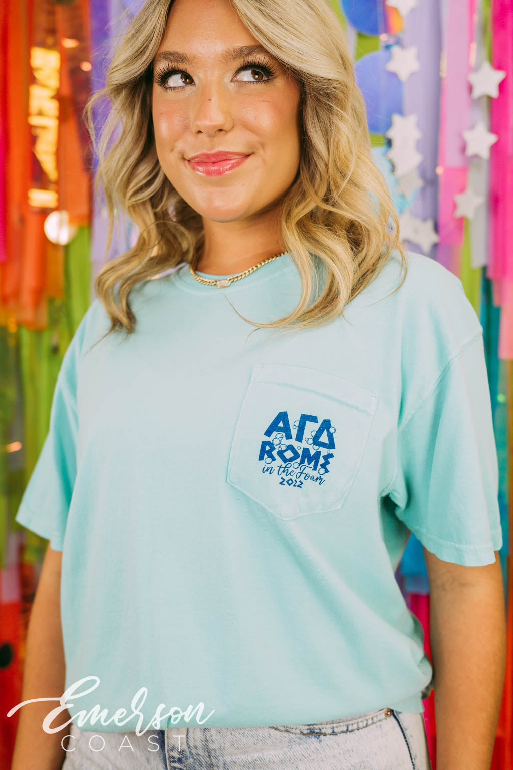 Tri Delta at Arkansas captured the magic of the Amalfi Coast for Bid Day with custom slouchy tees — white for members, cloud blue for new girls. Styled with flowy skirts and neck scarves, the whole vibe was straight out of a summer postcard.