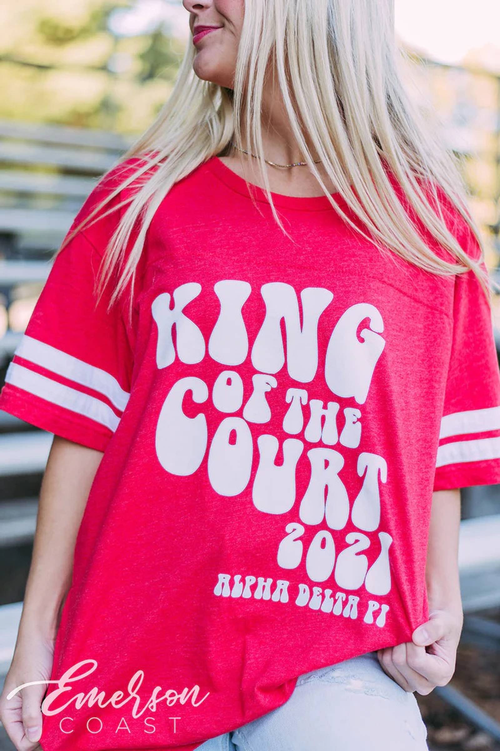 The bright red and sporty vibe makes this tee perfect for Fall and Spring events.