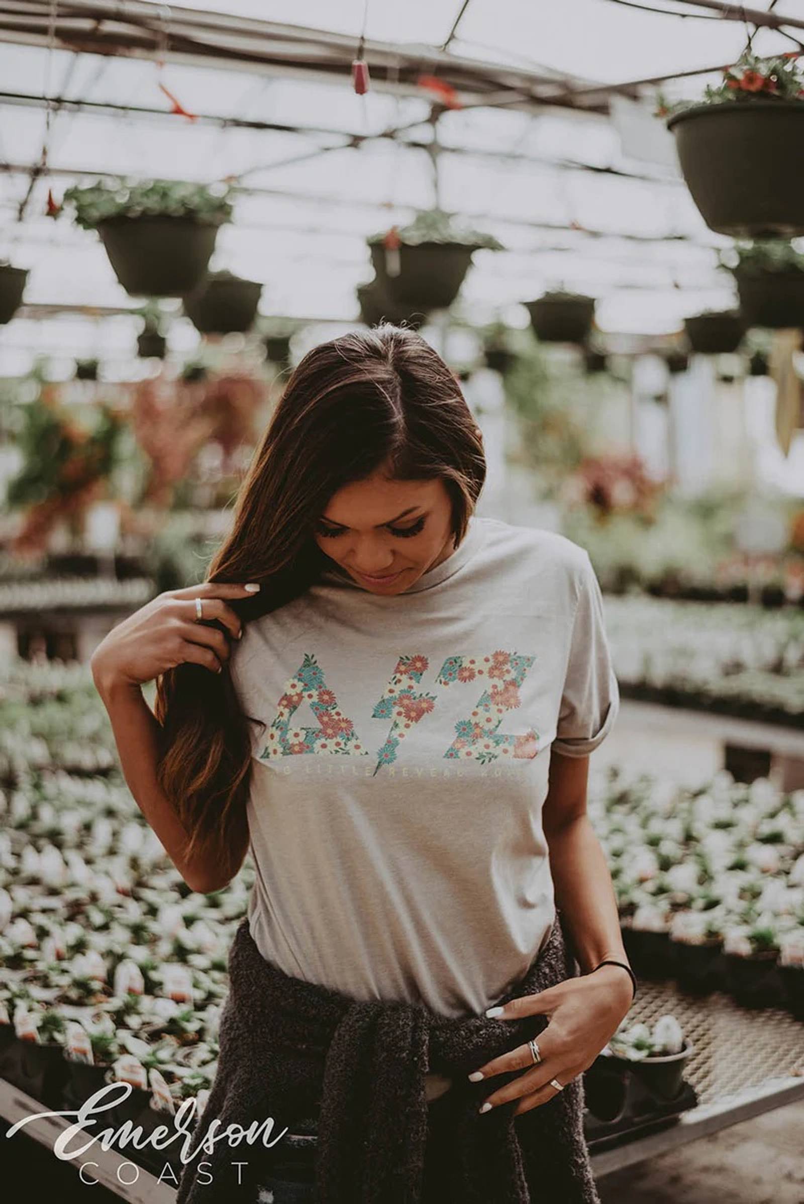 Create the cutest big little shirts by adding your sorority's letters and floral designs to this heather stone rolled cuff tee.