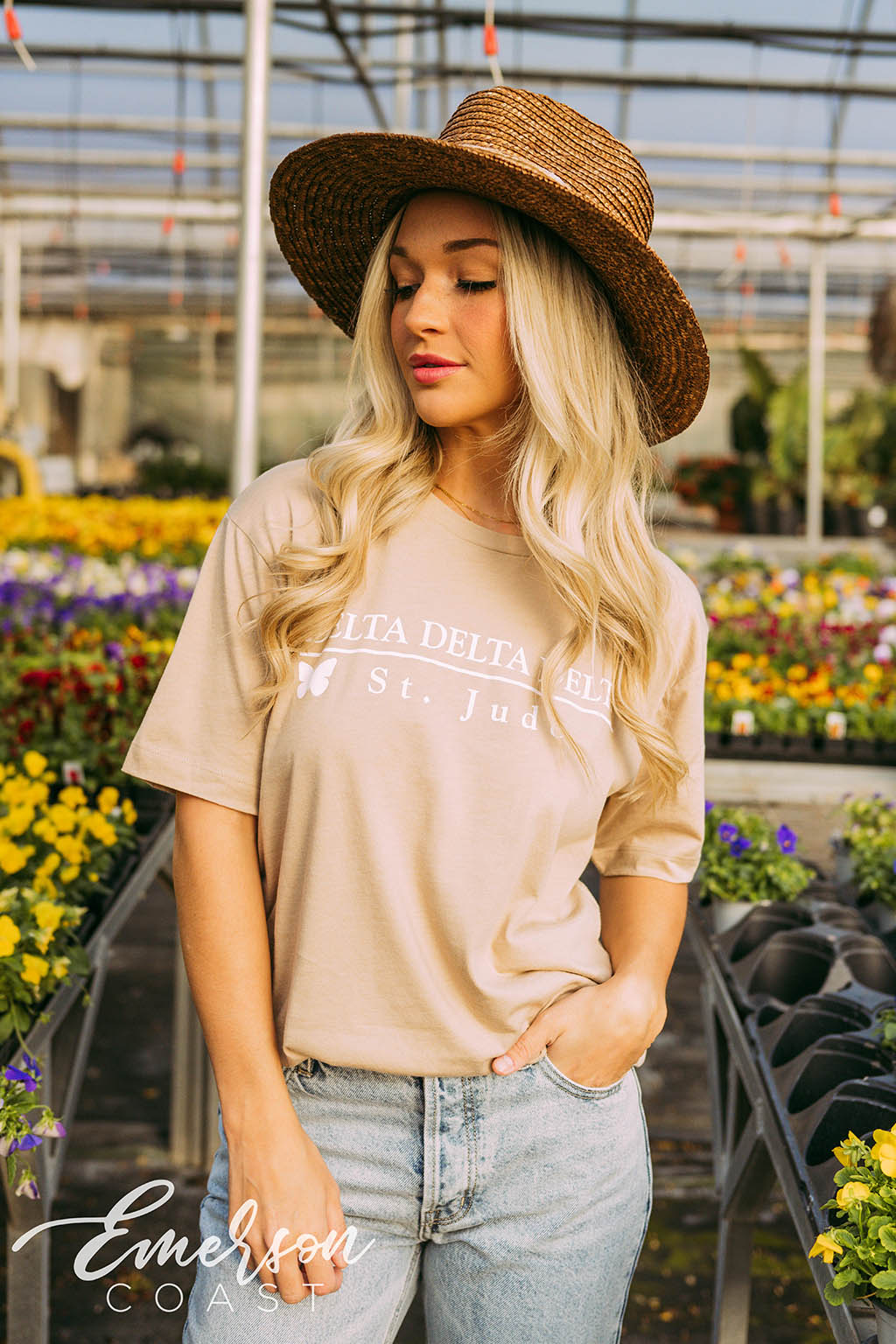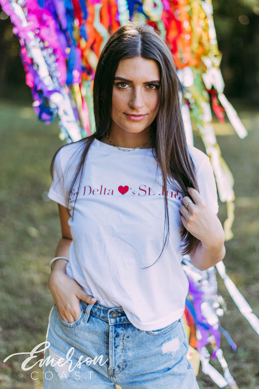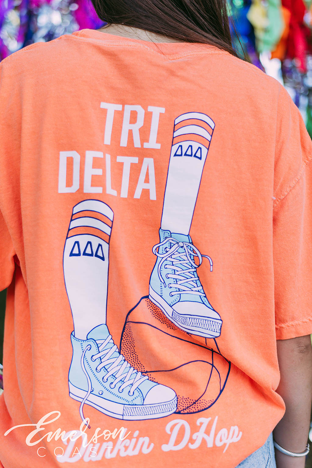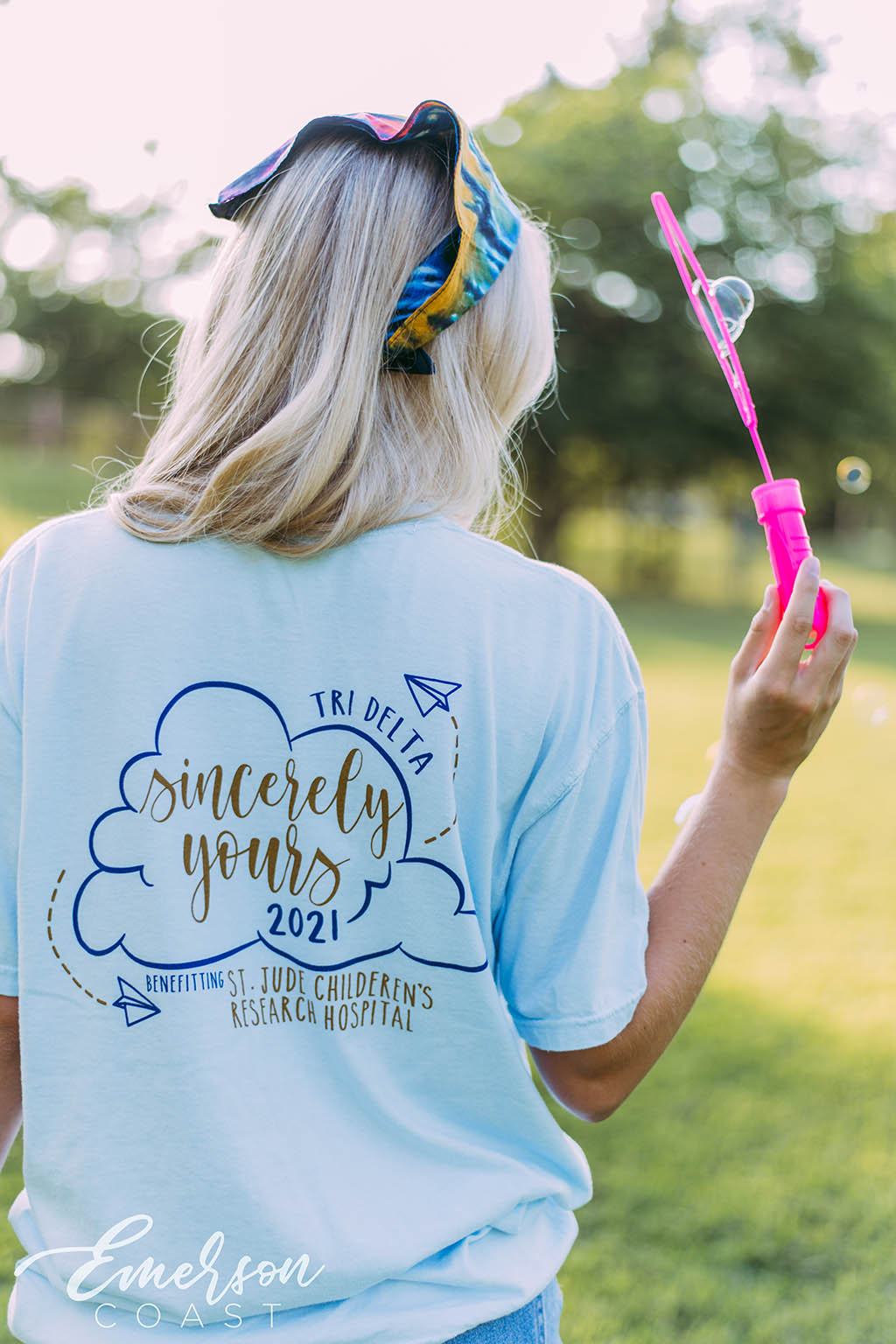 Tri Delta at Arkansas captured the magic of the Amalfi Coast for Bid Day with custom slouchy tees — white for members, cloud blue for new girls. Styled with flowy skirts and neck scarves, the whole vibe was straight out of a summer postcard.