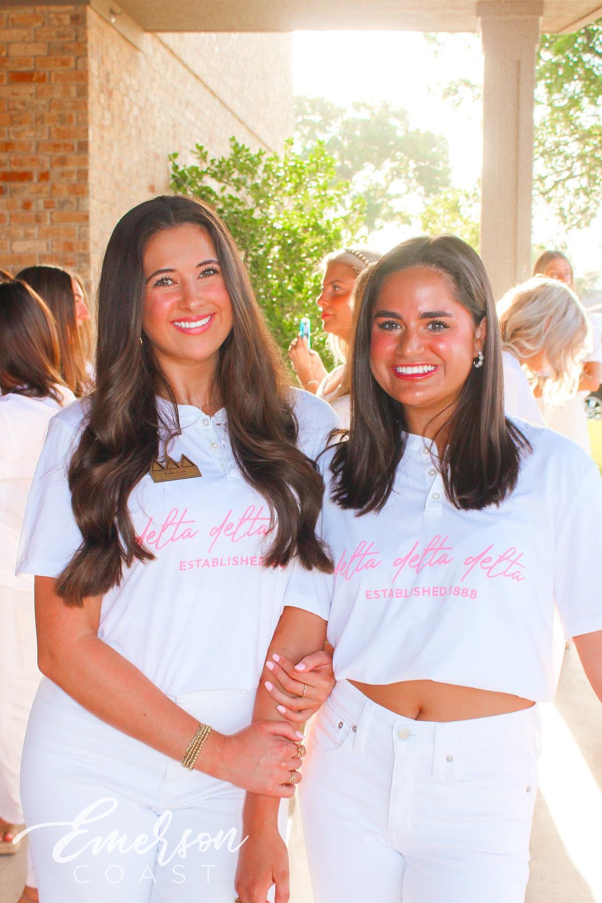 Tri Delta at Arkansas captured the magic of the Amalfi Coast for Bid Day with custom slouchy tees — white for members, cloud blue for new girls. Styled with flowy skirts and neck scarves, the whole vibe was straight out of a summer postcard.