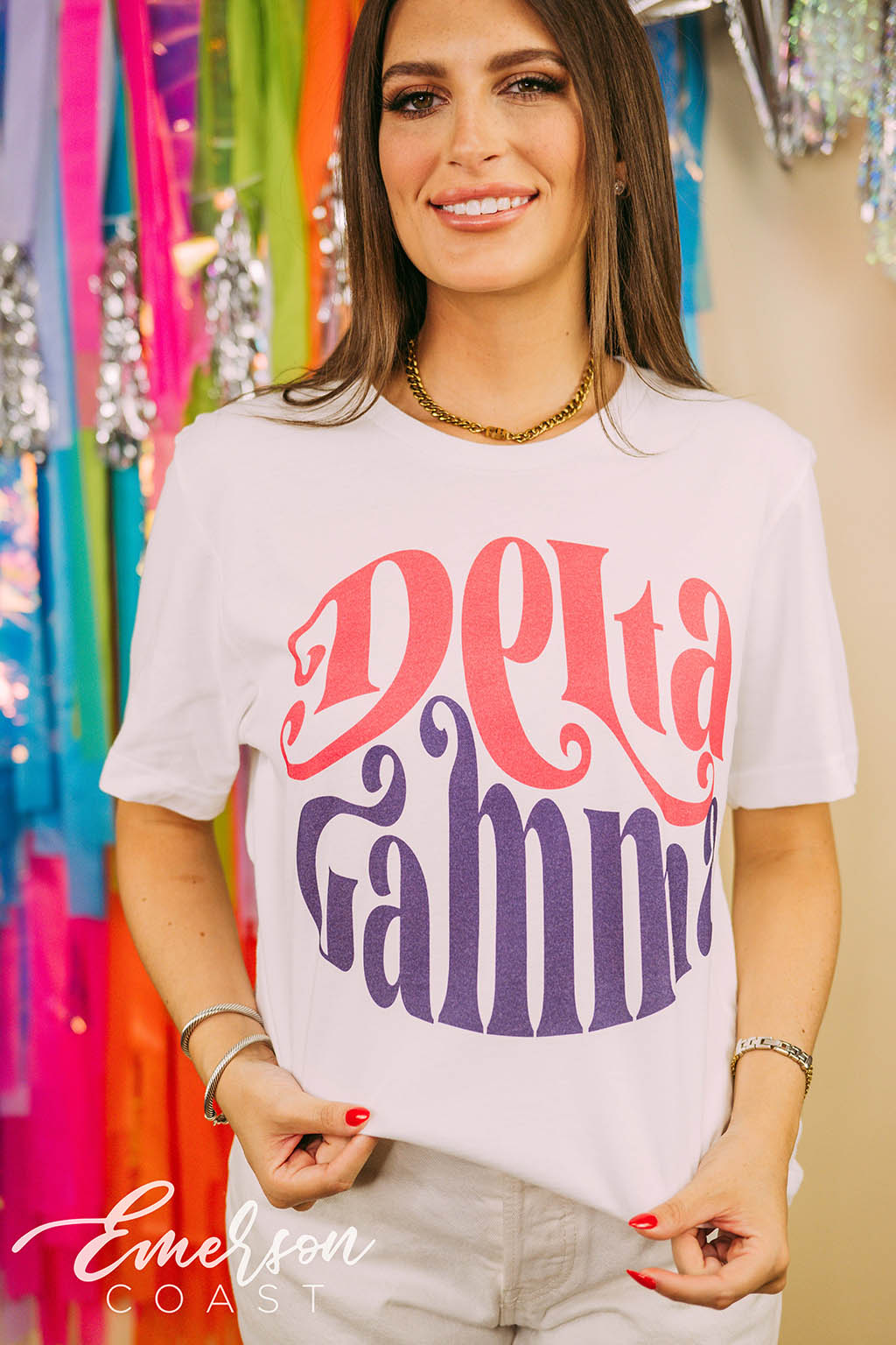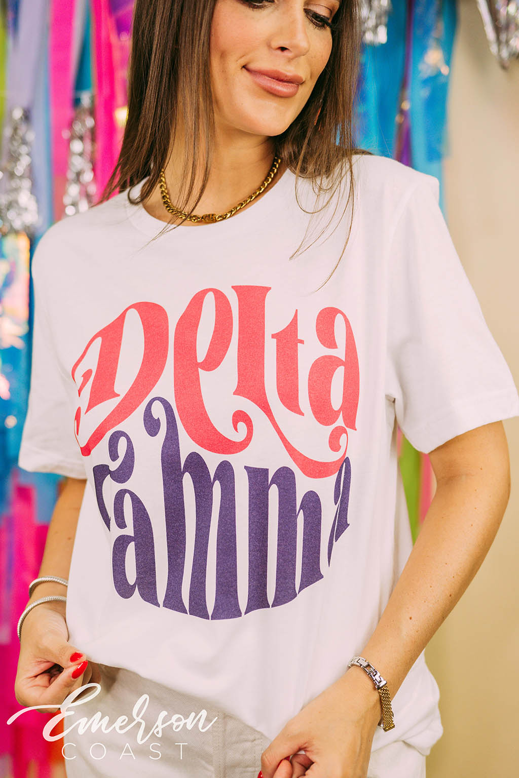 Tri Delta at Arkansas captured the magic of the Amalfi Coast for Bid Day with custom slouchy tees — white for members, cloud blue for new girls. Styled with flowy skirts and neck scarves, the whole vibe was straight out of a summer postcard.