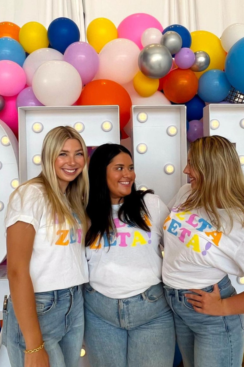 Gamma Phi at Oklahoma State floated into Bid Day with the dreamiest hot air balloon theme and the cutest pink colorblock ringer tees! Featuring soft pastel Greek letters, these tops added a fun pop of retro charm to an already magical day.