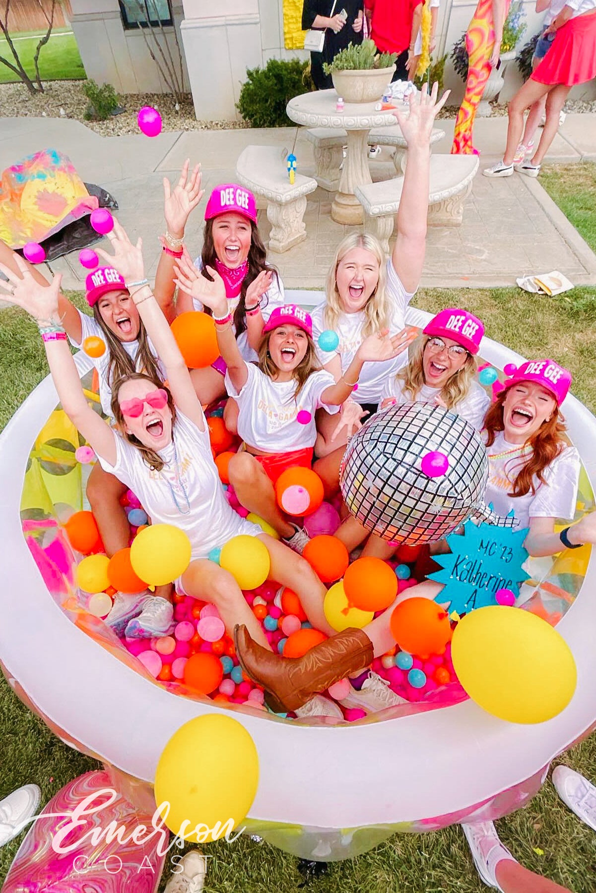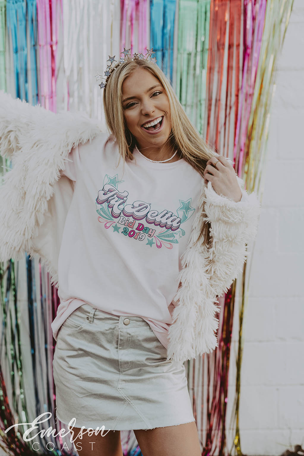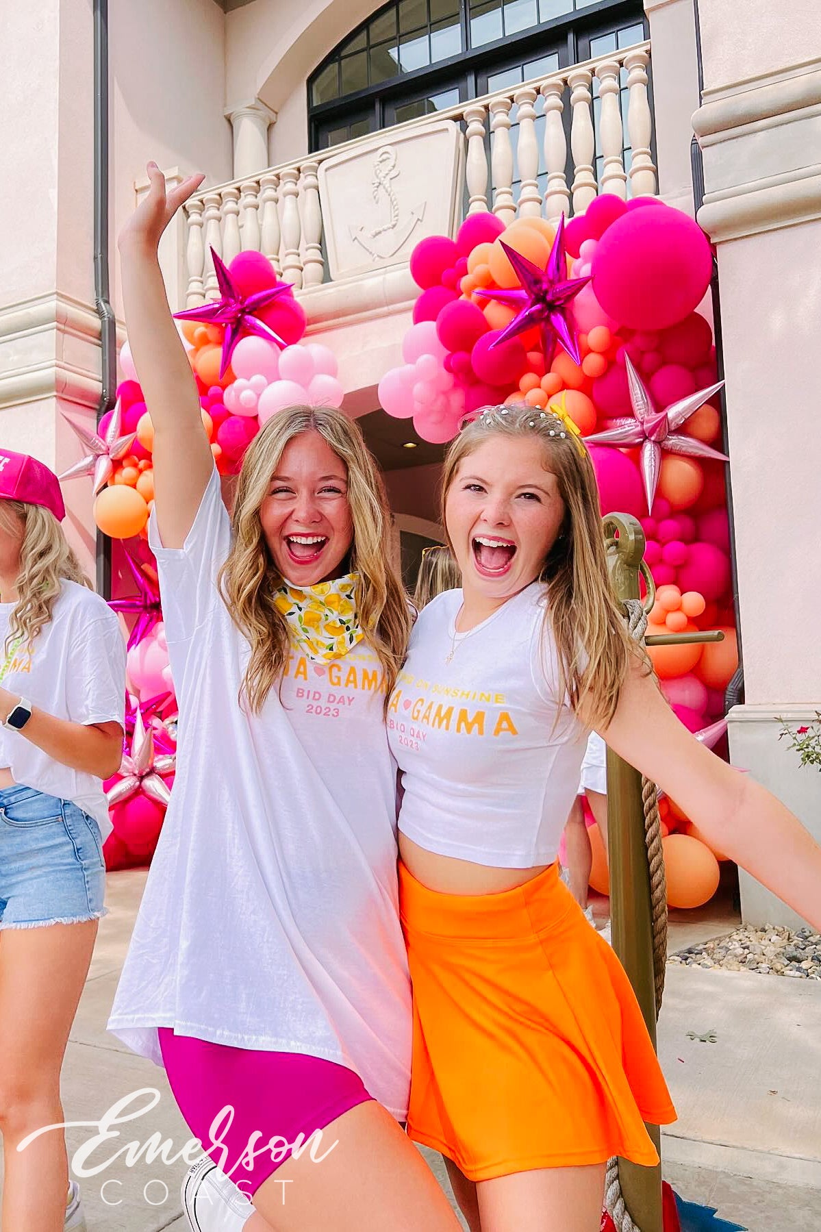 Gamma Phi at Oklahoma State floated into Bid Day with the dreamiest hot air balloon theme and the cutest pink colorblock ringer tees! Featuring soft pastel Greek letters, these tops added a fun pop of retro charm to an already magical day.