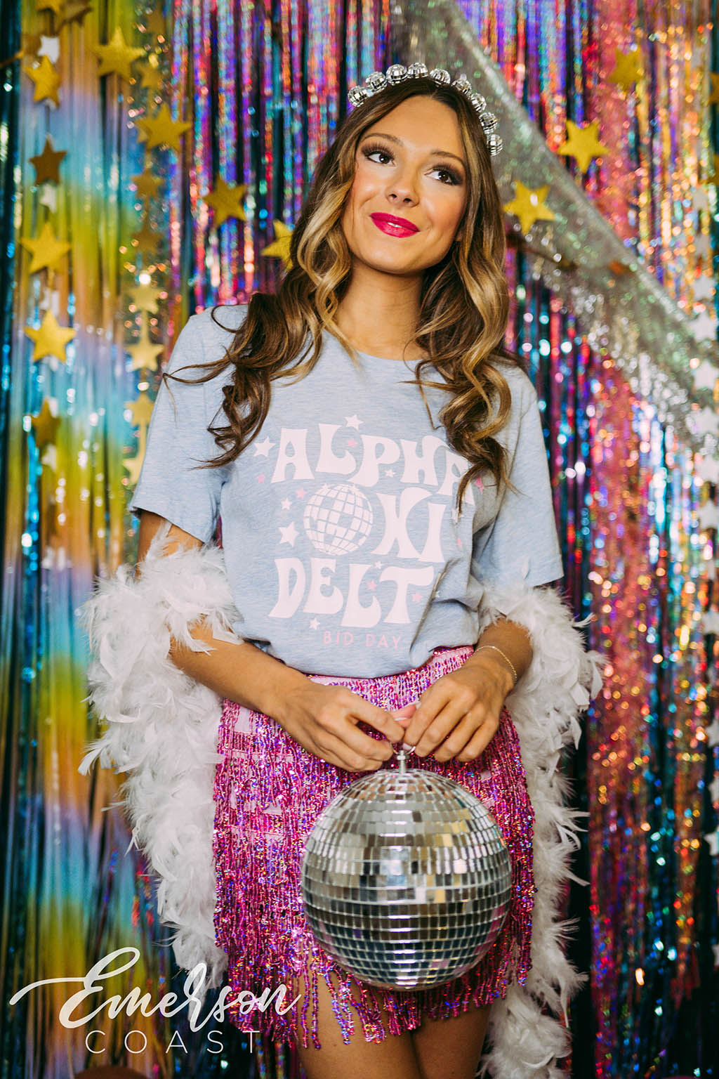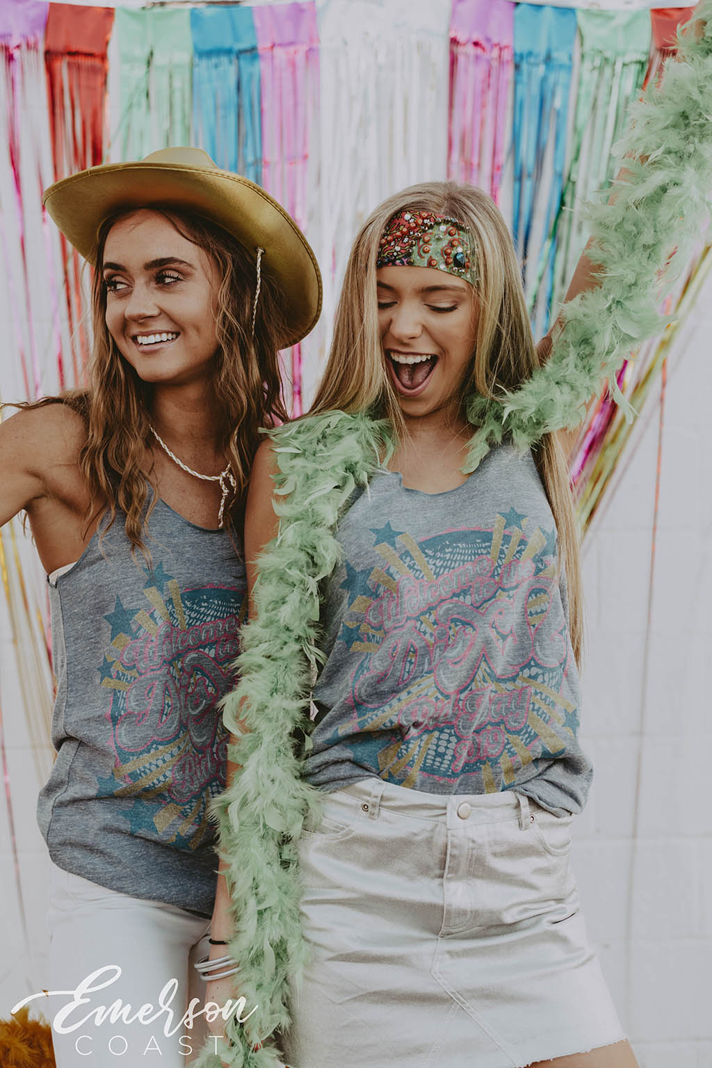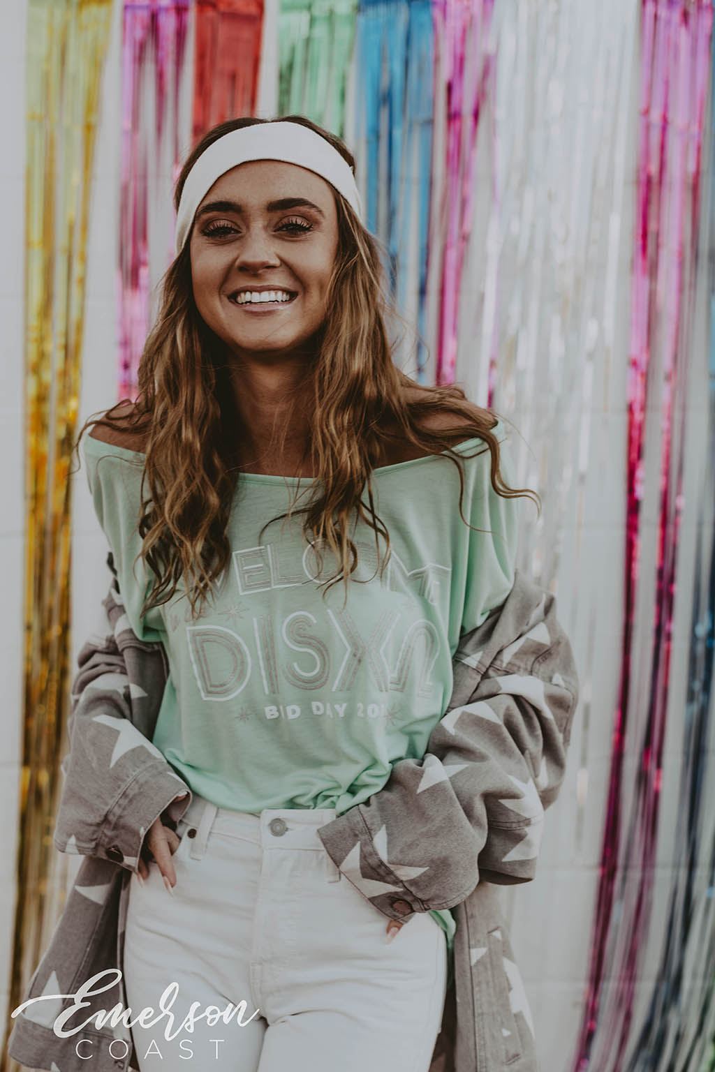 You can style each of these designs however you want! For the disco theme, it's all about the many styling options you can have. For the green off the shoulder tee, pair it with white jeans or shorts, and of course disco ball earrings. A rainbow neck scarf is what you have to throw on when you wear the disco bid day tanks. The rainbow matches perfectly with the white and silver letters on the tank. For the dark grey henley tee, you can go more casual and wear sneakers or dress it up with some go-go boots. Go with the oversized vibe or tie the t-shirt in a knot or rock the front tuck.