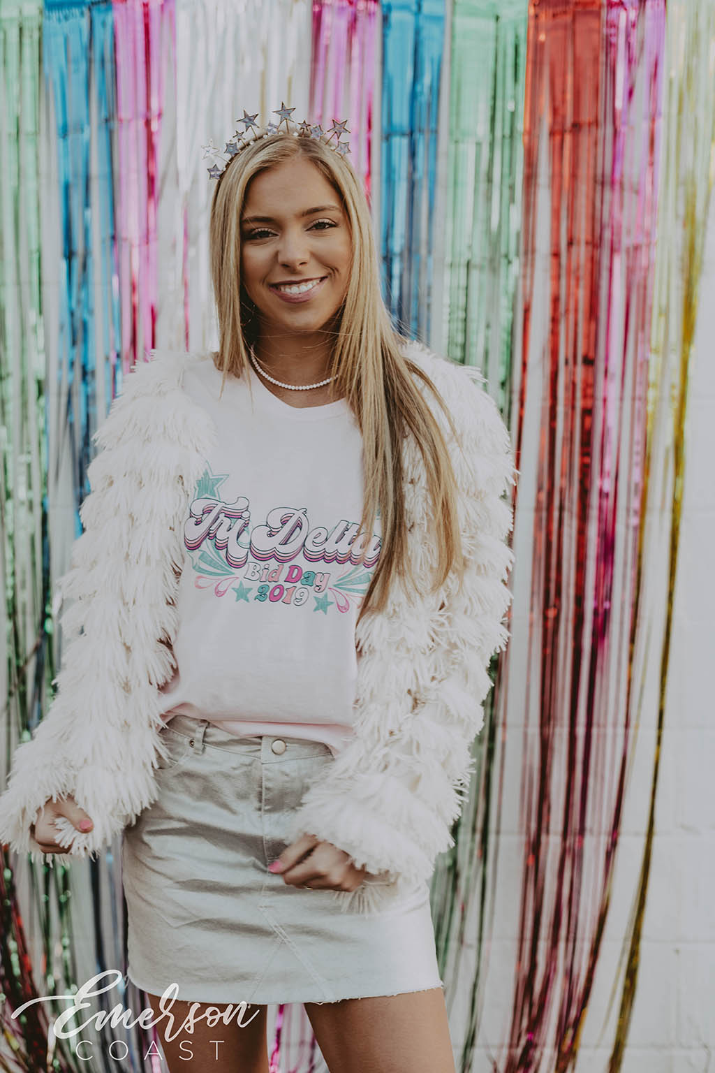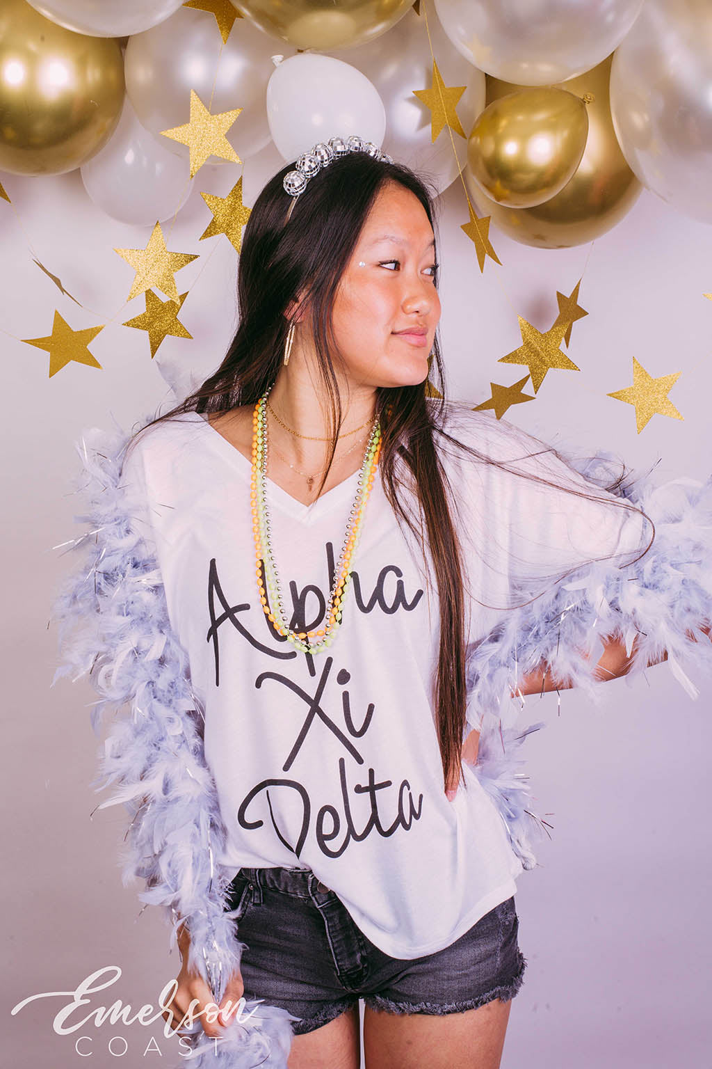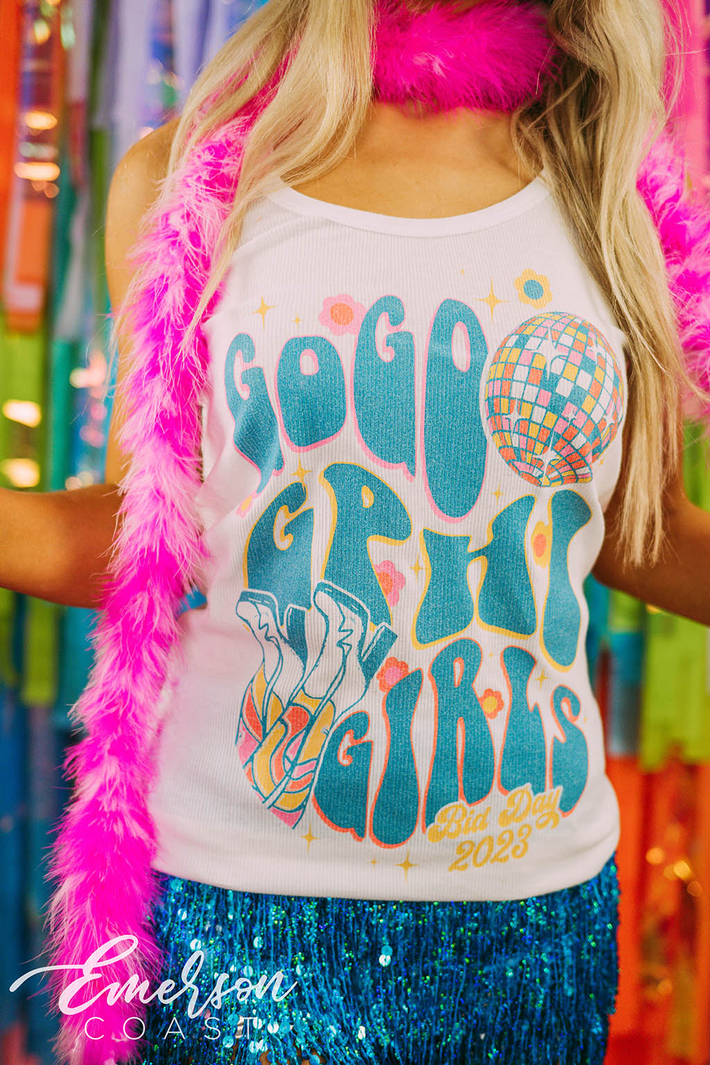 You can style each of these designs however you want! For the disco theme, it's all about the many styling options you can have. For the green off the shoulder tee, pair it with white jeans or shorts, and of course disco ball earrings. A rainbow neck scarf is what you have to throw on when you wear the disco bid day tanks. The rainbow matches perfectly with the white and silver letters on the tank. For the dark grey henley tee, you can go more casual and wear sneakers or dress it up with some go-go boots. Go with the oversized vibe or tie the t-shirt in a knot or rock the front tuck.