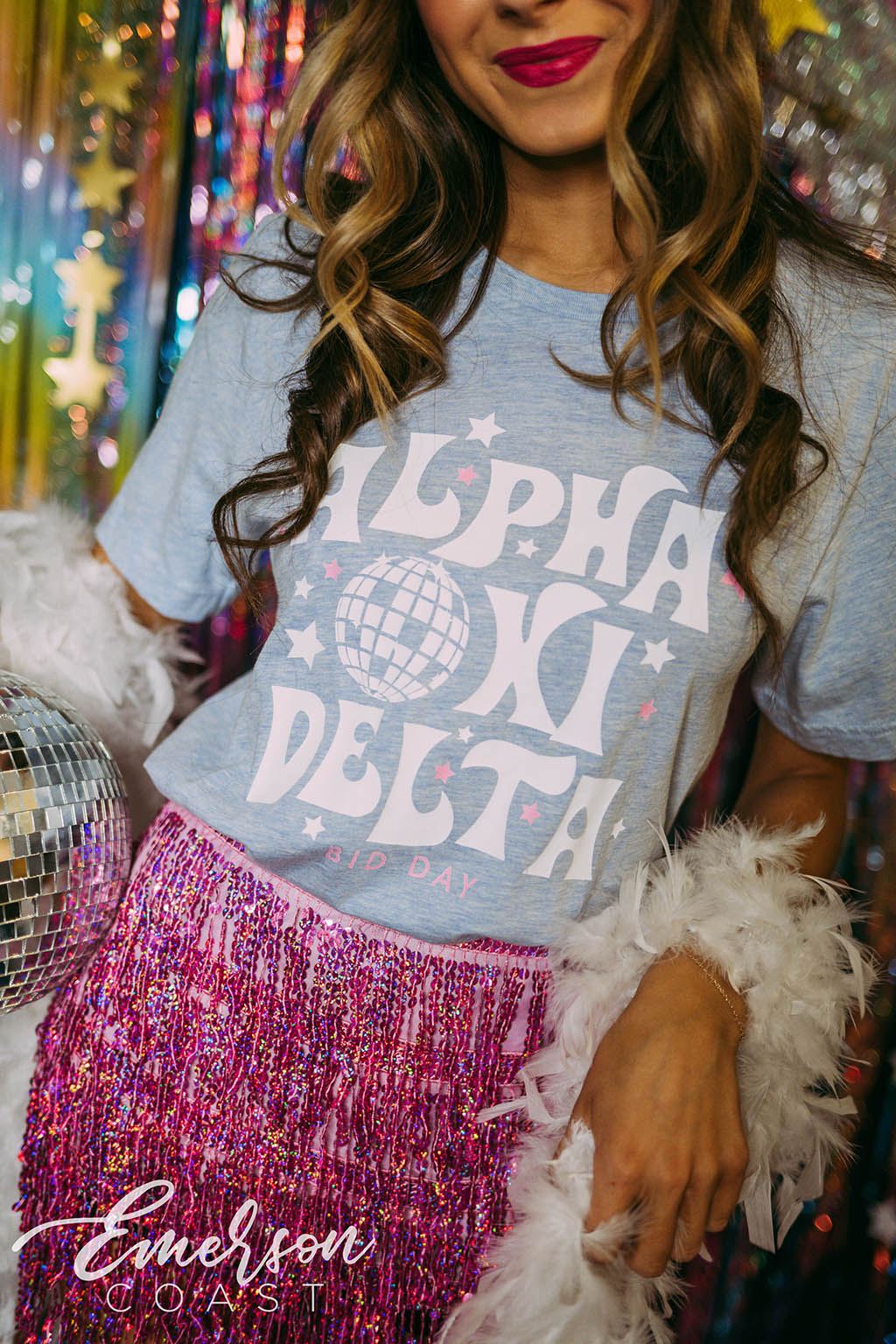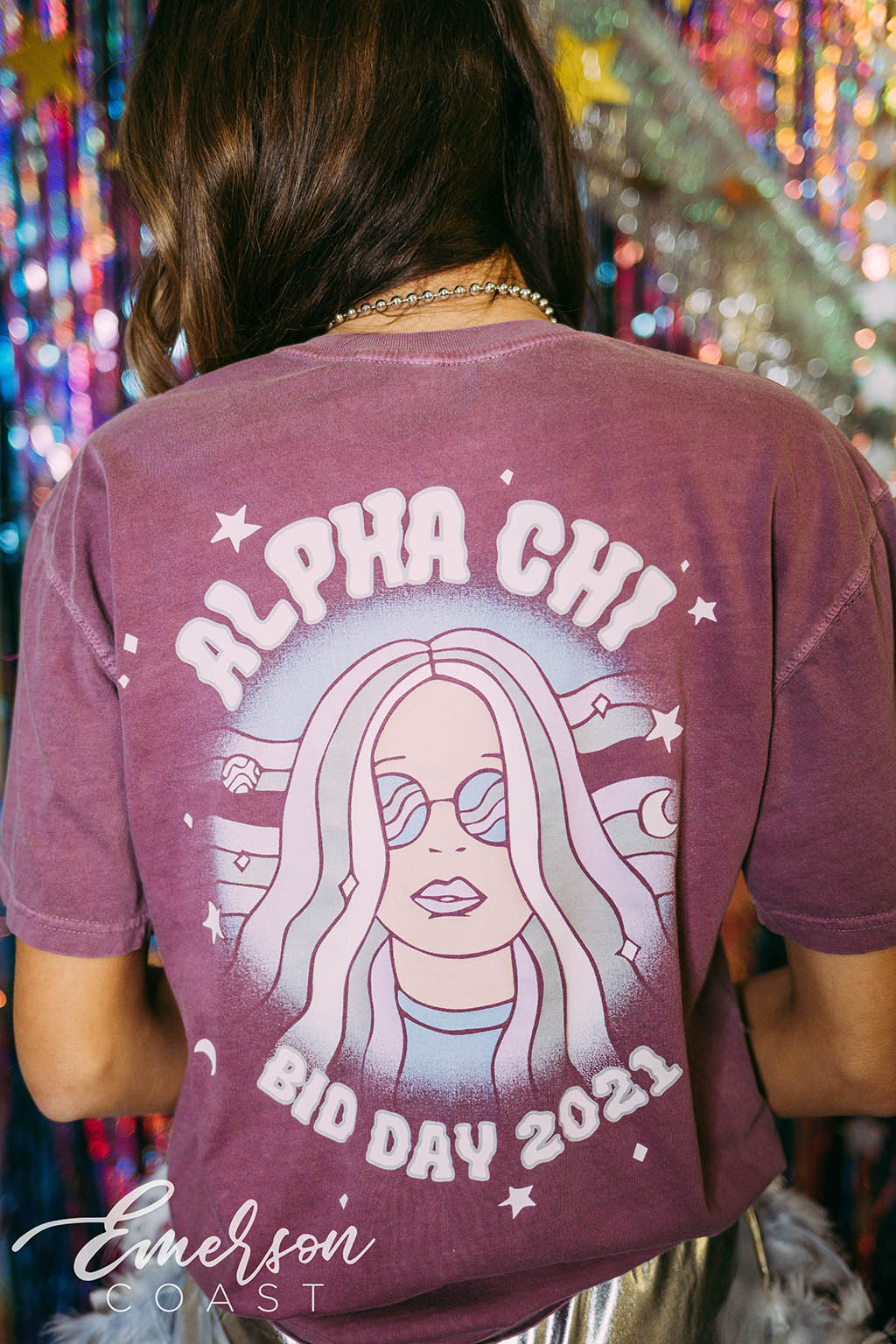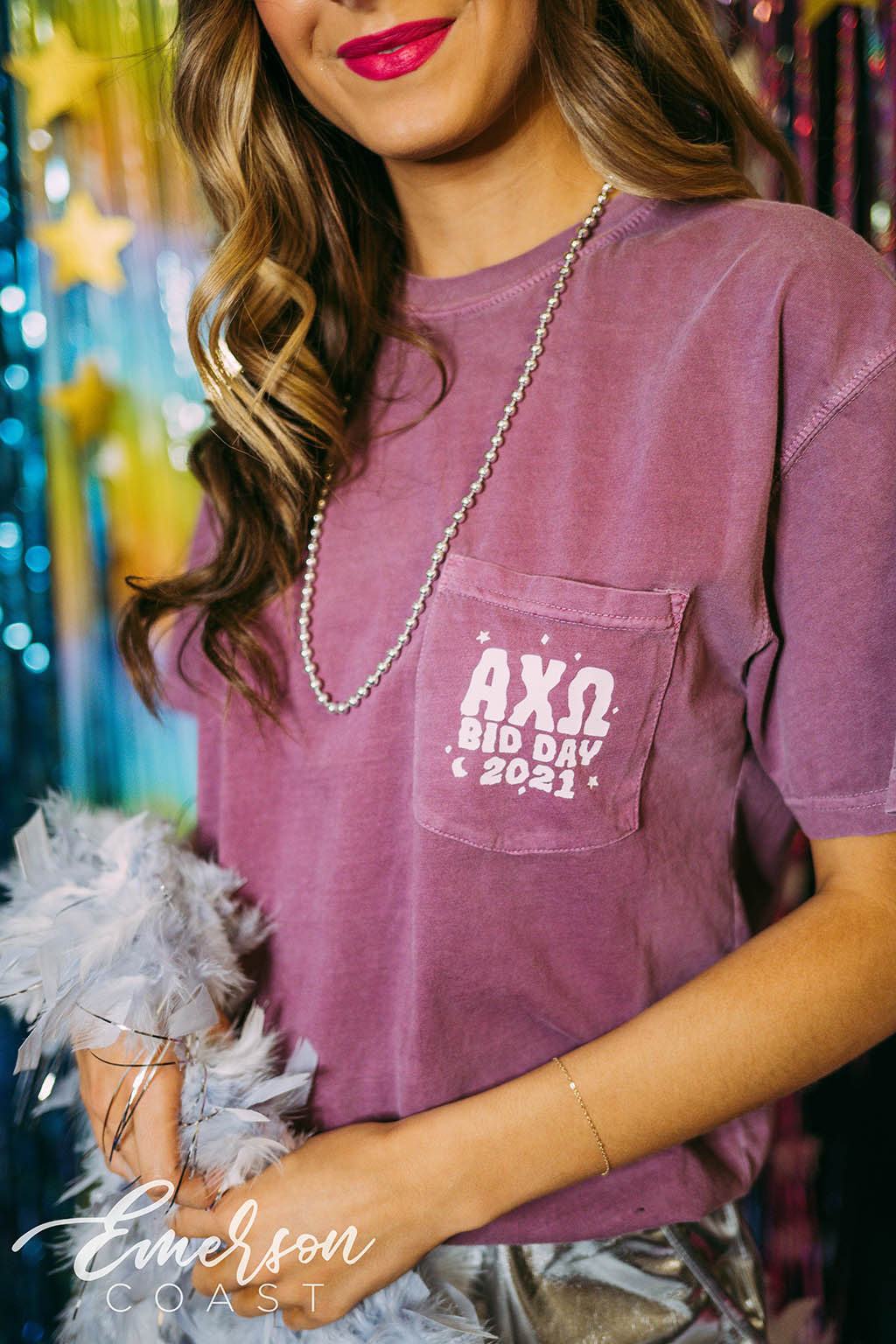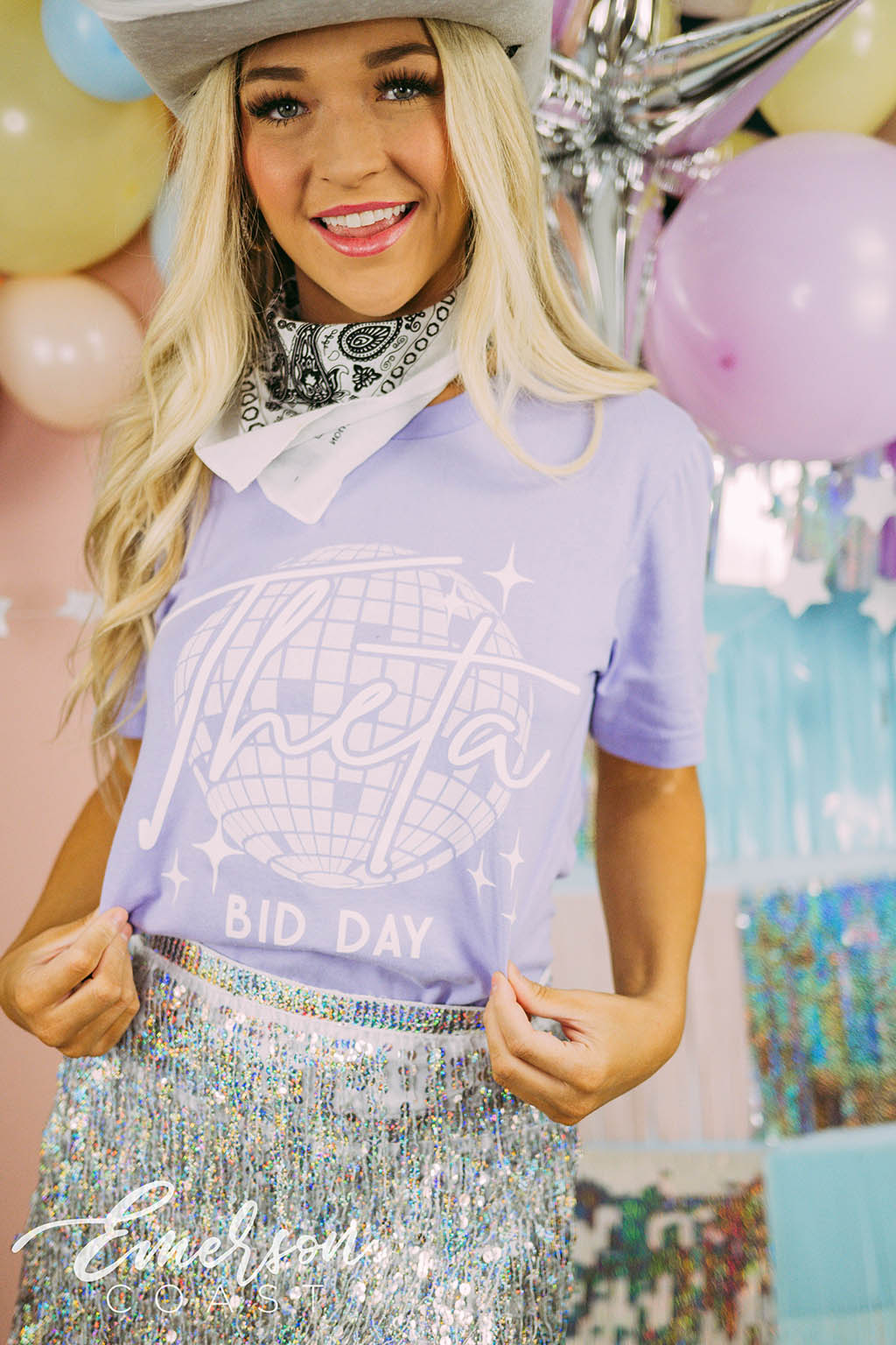The best theme for that is our disco themed bid day! The designs you can create with this theme are ENDLESS! The Chi O Disco Bid day tee is a MUST HAVE for your disco theme. It's off the shoulder and flowy look is the ideal bid day look. The DG Disco Bid Day Tank is going to shine bright on your new members. With its many styling options your chapter will all obsess over it because everyone can make it their own. The Sigma Delta Tau Henley is very detailed and versatile, with its neutral colors, it will make with everything. All the disco themed bid day designs will be memorable for every new member.