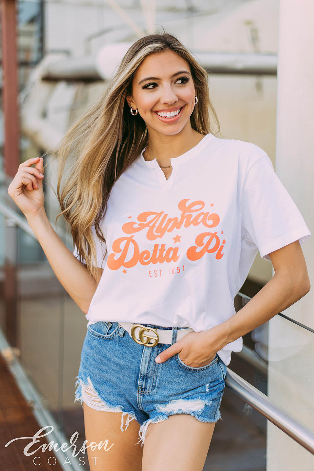 Tri Delta at Arkansas captured the magic of the Amalfi Coast for Bid Day with custom slouchy tees — white for members, cloud blue for new girls. Styled with flowy skirts and neck scarves, the whole vibe was straight out of a summer postcard.