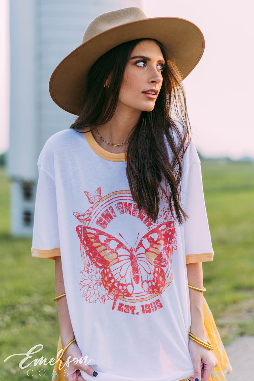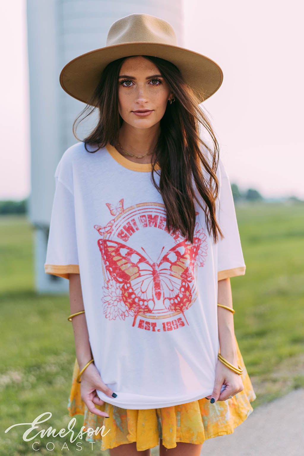 Chi O will be feeling all the good vibes in this distressed butterfly tee.