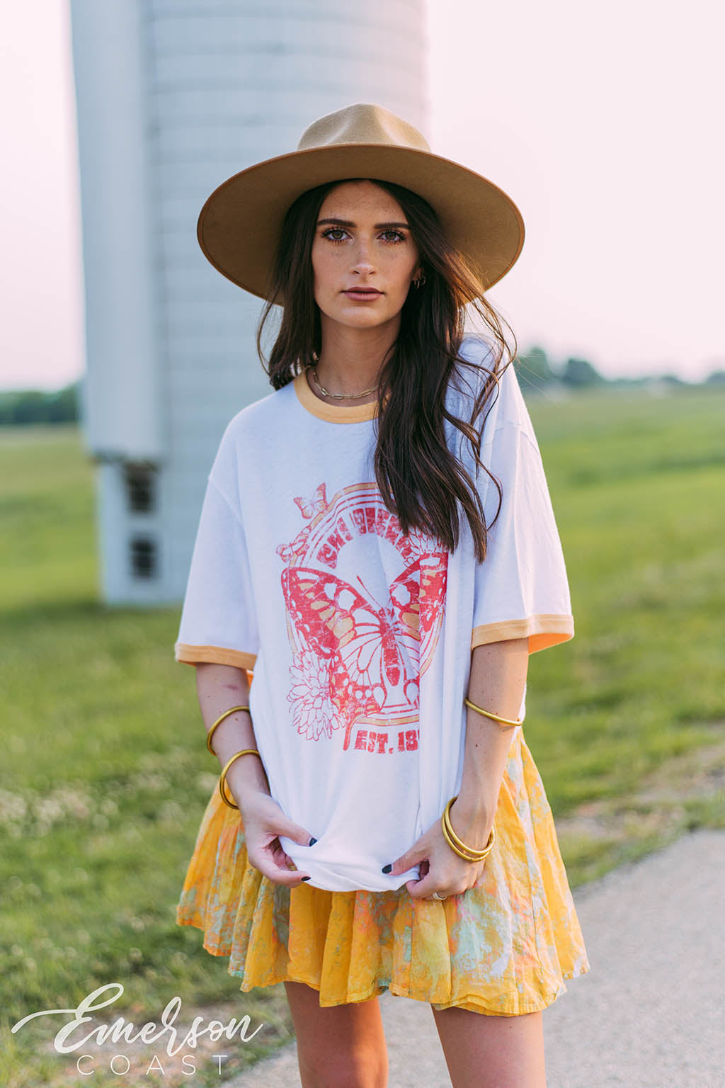 The sunset color scheme on this tee is gorg - so add some accessories that match! We're talking neutrals, yellows, and light reds!