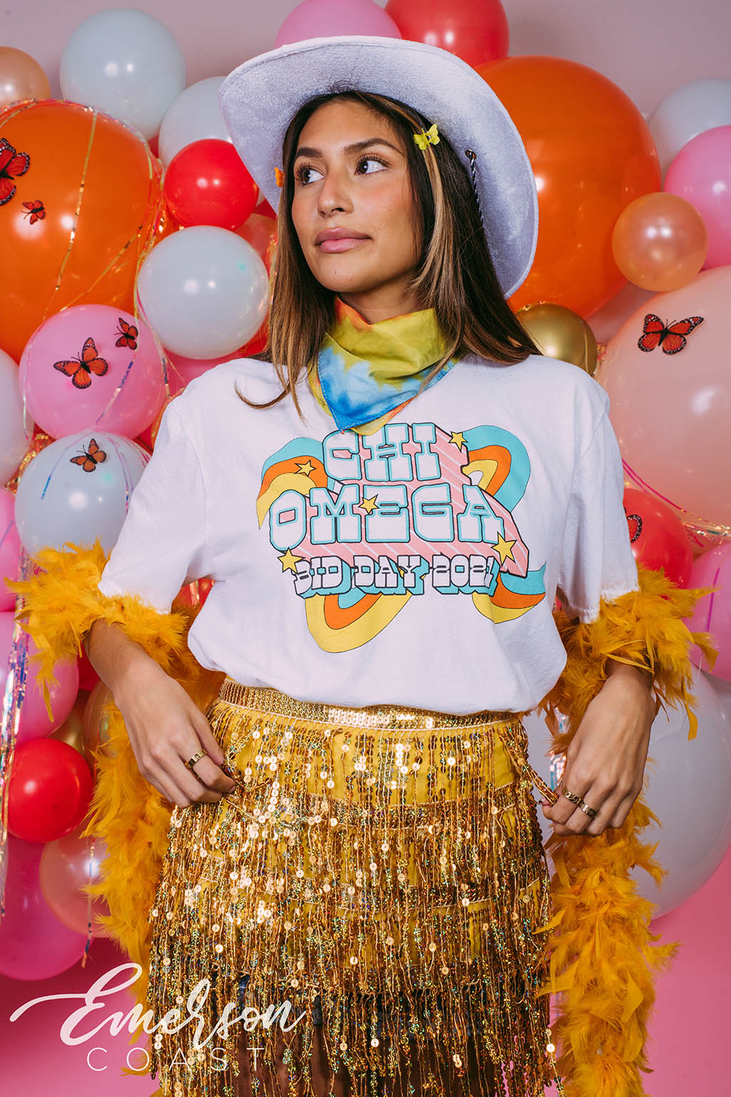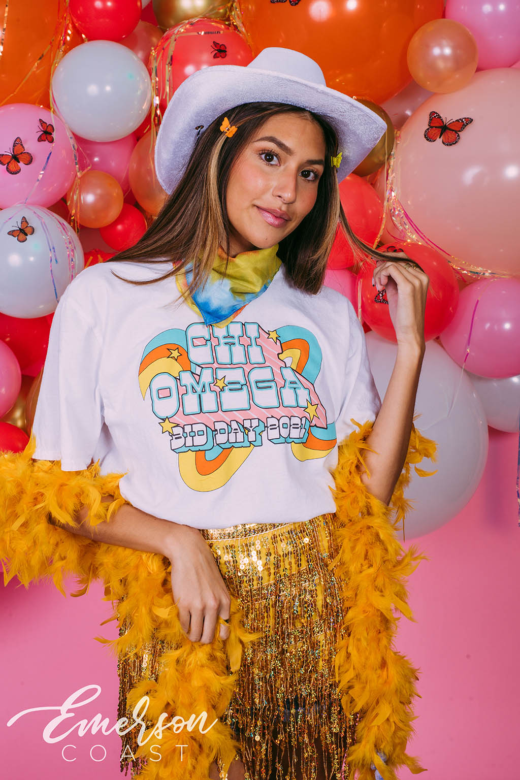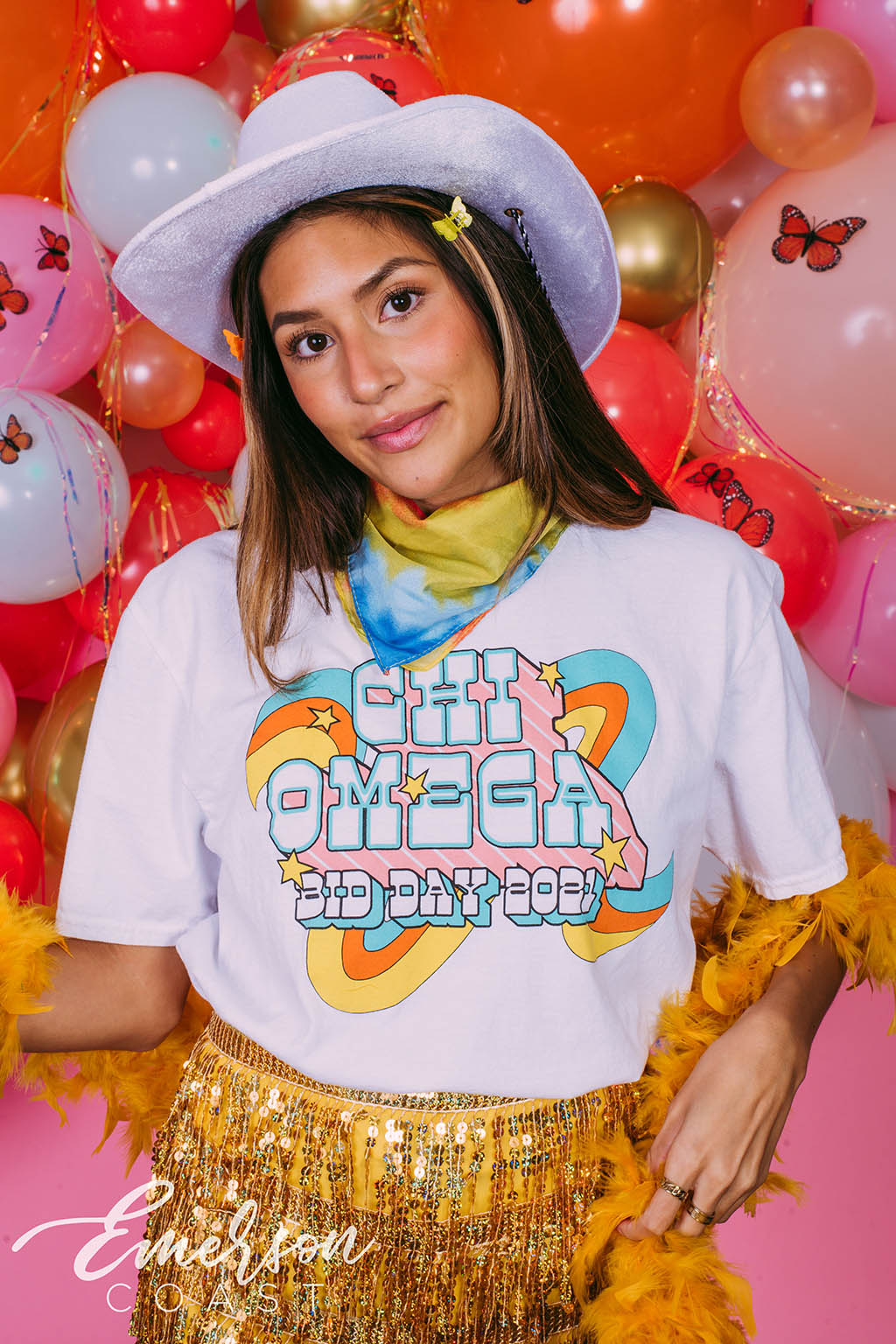 Make it shine with the Chi Omega Golden Hour Rainbow Bid Day Tee!