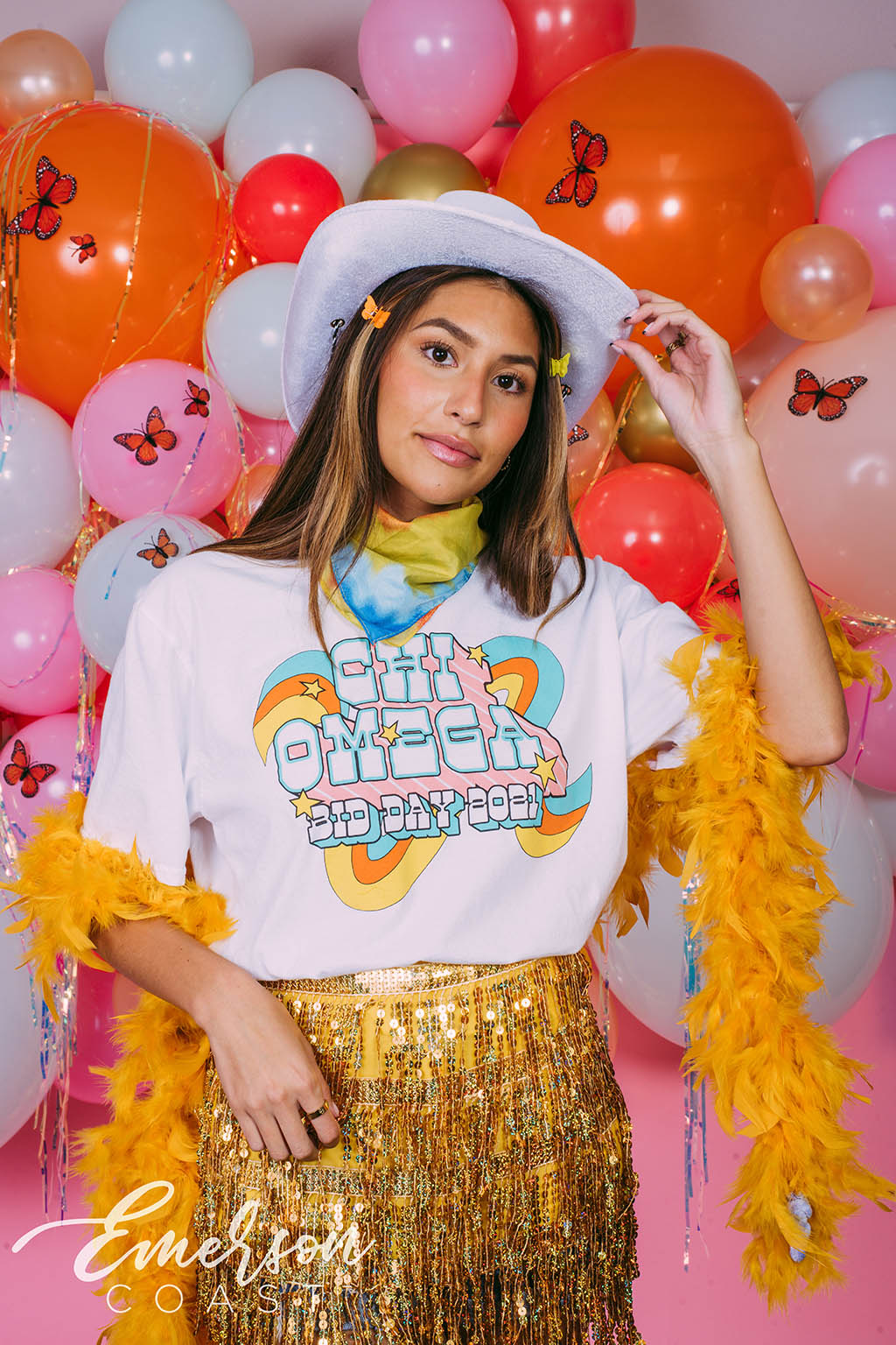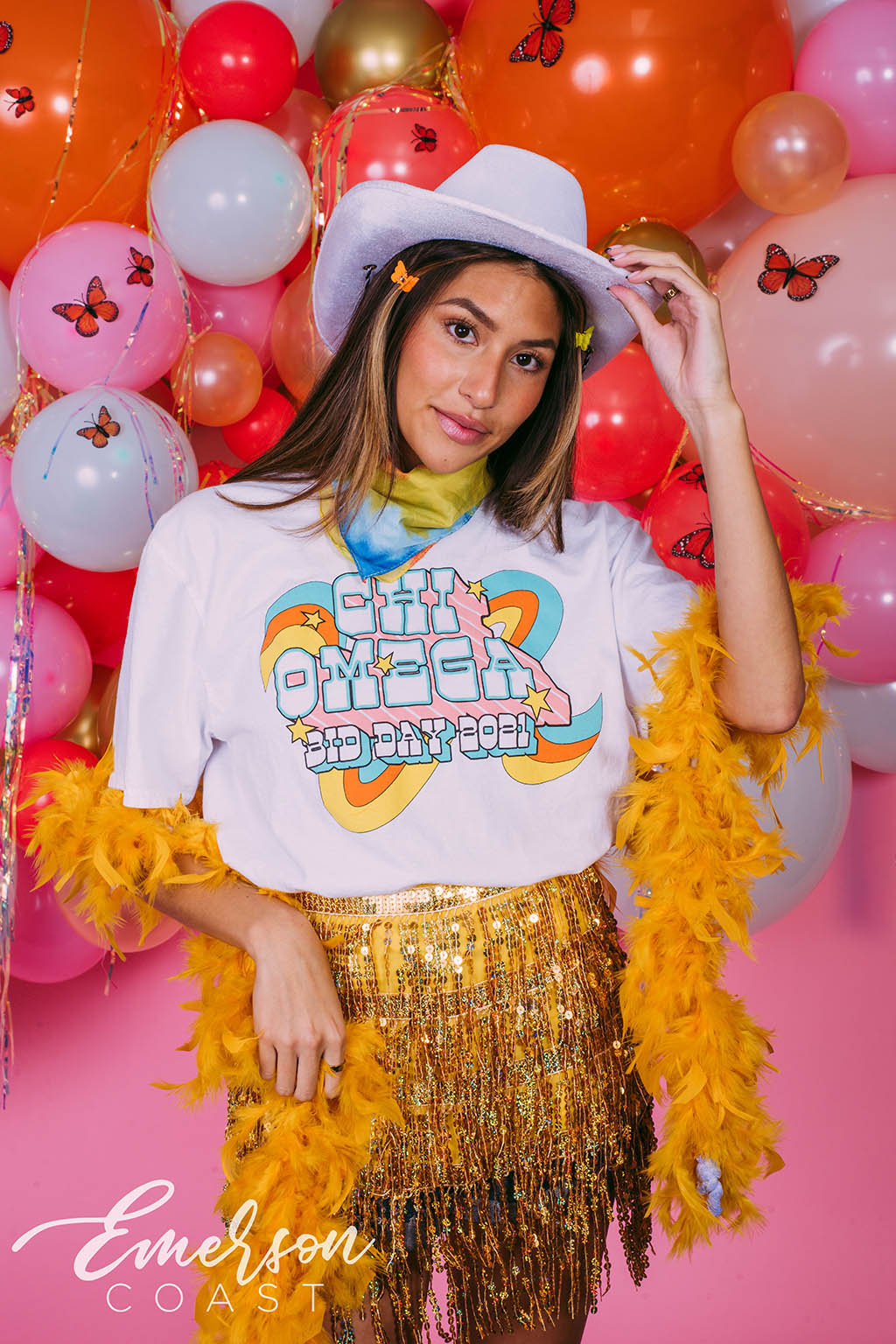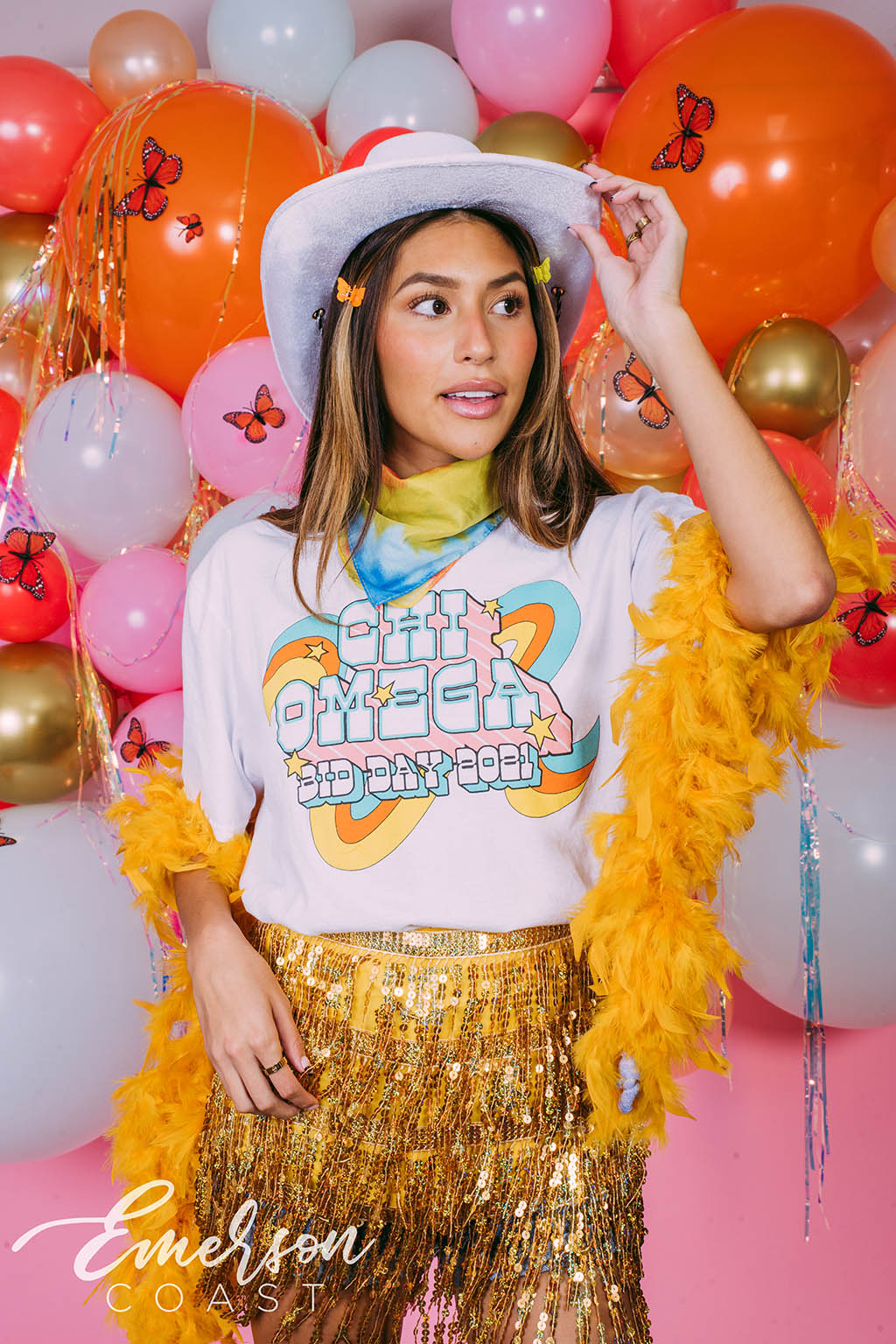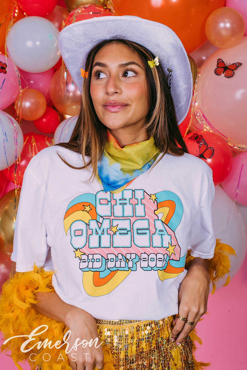 Make it shine with the Chi Omega Golden Hour Rainbow Bid Day Tee!