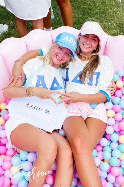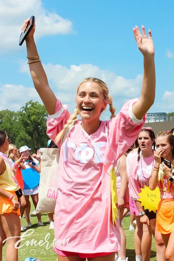 Gamma Phi at Oklahoma State floated into Bid Day with the dreamiest hot air balloon theme and the cutest pink colorblock ringer tees! Featuring soft pastel Greek letters, these tops added a fun pop of retro charm to an already magical day.