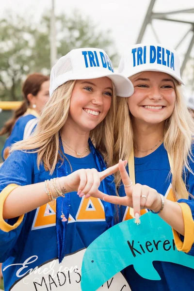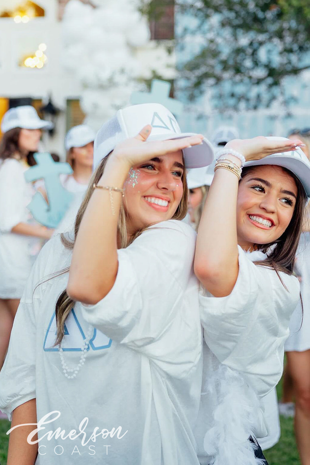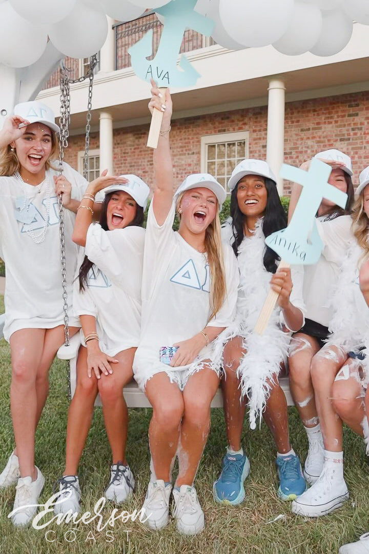 Tri Delta at Arkansas captured the magic of the Amalfi Coast for Bid Day with custom slouchy tees — white for members, cloud blue for new girls. Styled with flowy skirts and neck scarves, the whole vibe was straight out of a summer postcard.