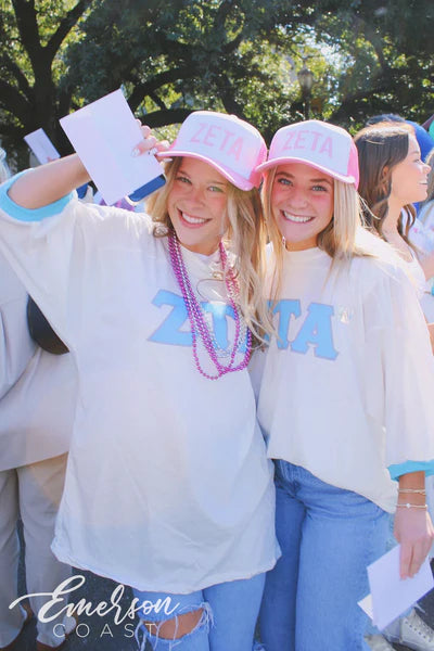 ZTA at Georgia Tech rocked custom teal slouchy tees for Recruitment, pairing them with white denim for a clean, polished look. The bold color choice made a statement while keeping things fun, fresh, and totally on brand.
