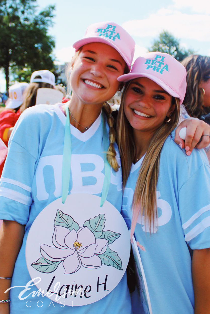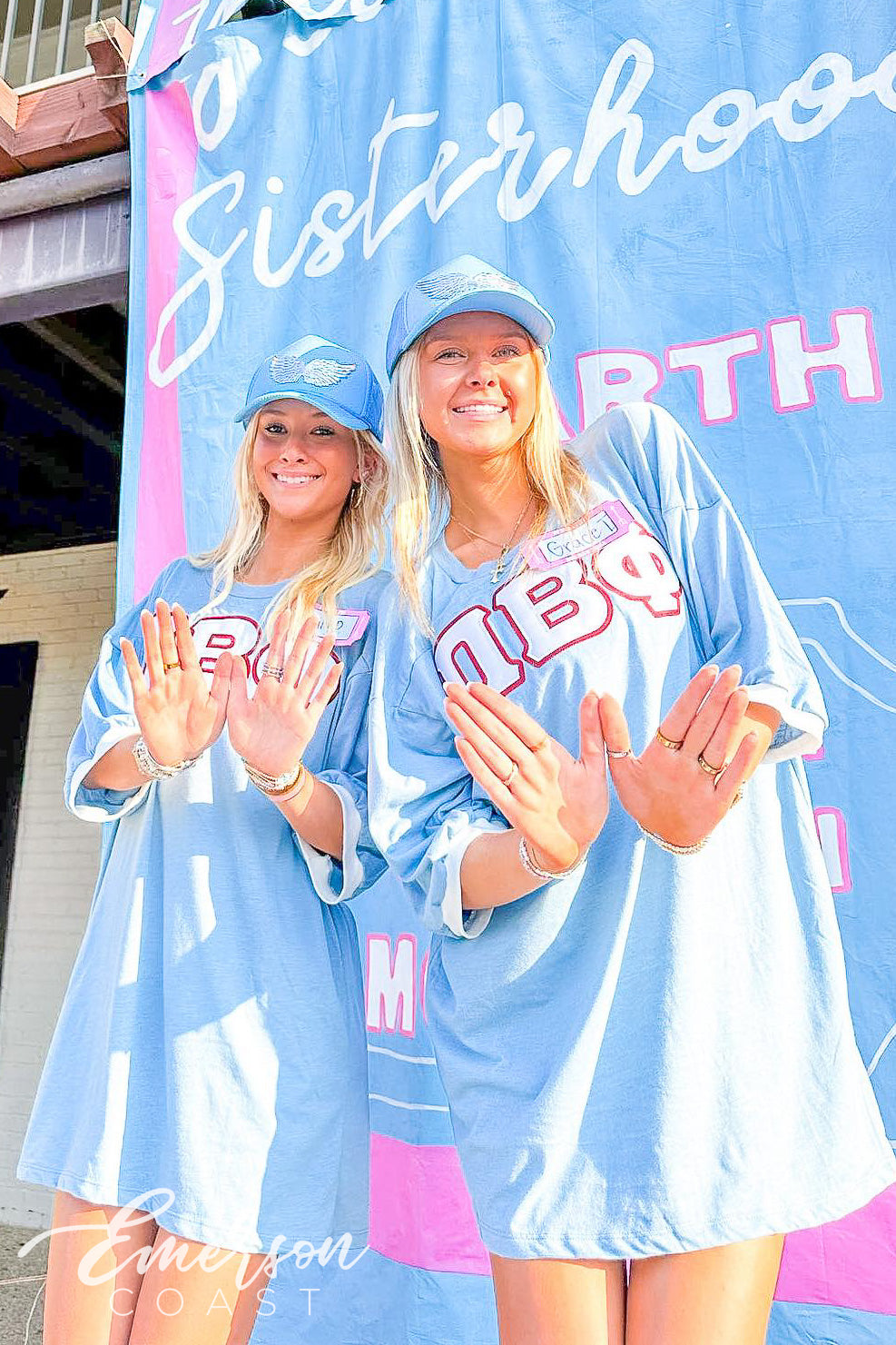 Tri Delta at Arkansas captured the magic of the Amalfi Coast for Bid Day with custom slouchy tees — white for members, cloud blue for new girls. Styled with flowy skirts and neck scarves, the whole vibe was straight out of a summer postcard.