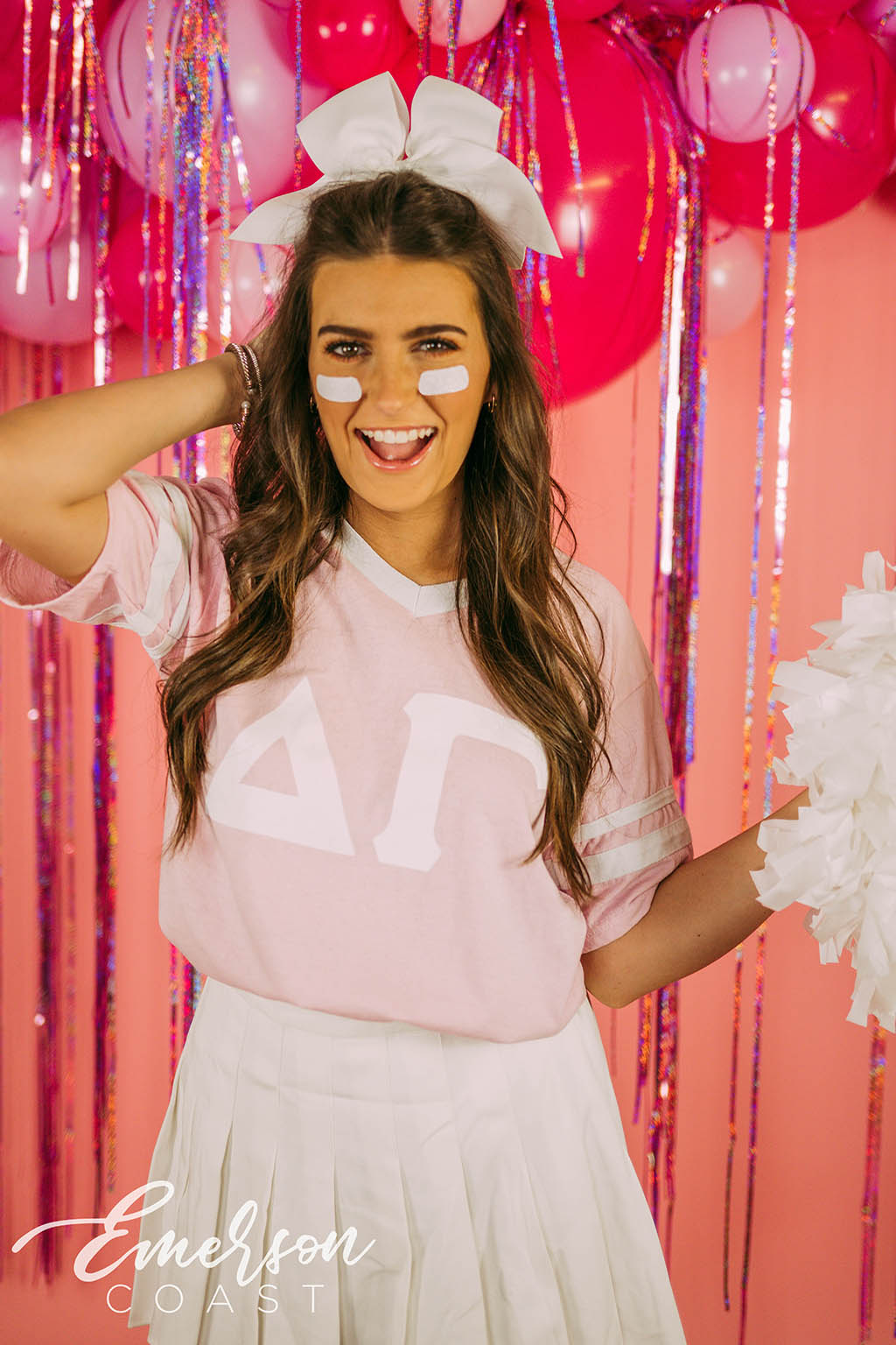 Gamma Phi at Oklahoma State floated into Bid Day with the dreamiest hot air balloon theme and the cutest pink colorblock ringer tees! Featuring soft pastel Greek letters, these tops added a fun pop of retro charm to an already magical day.