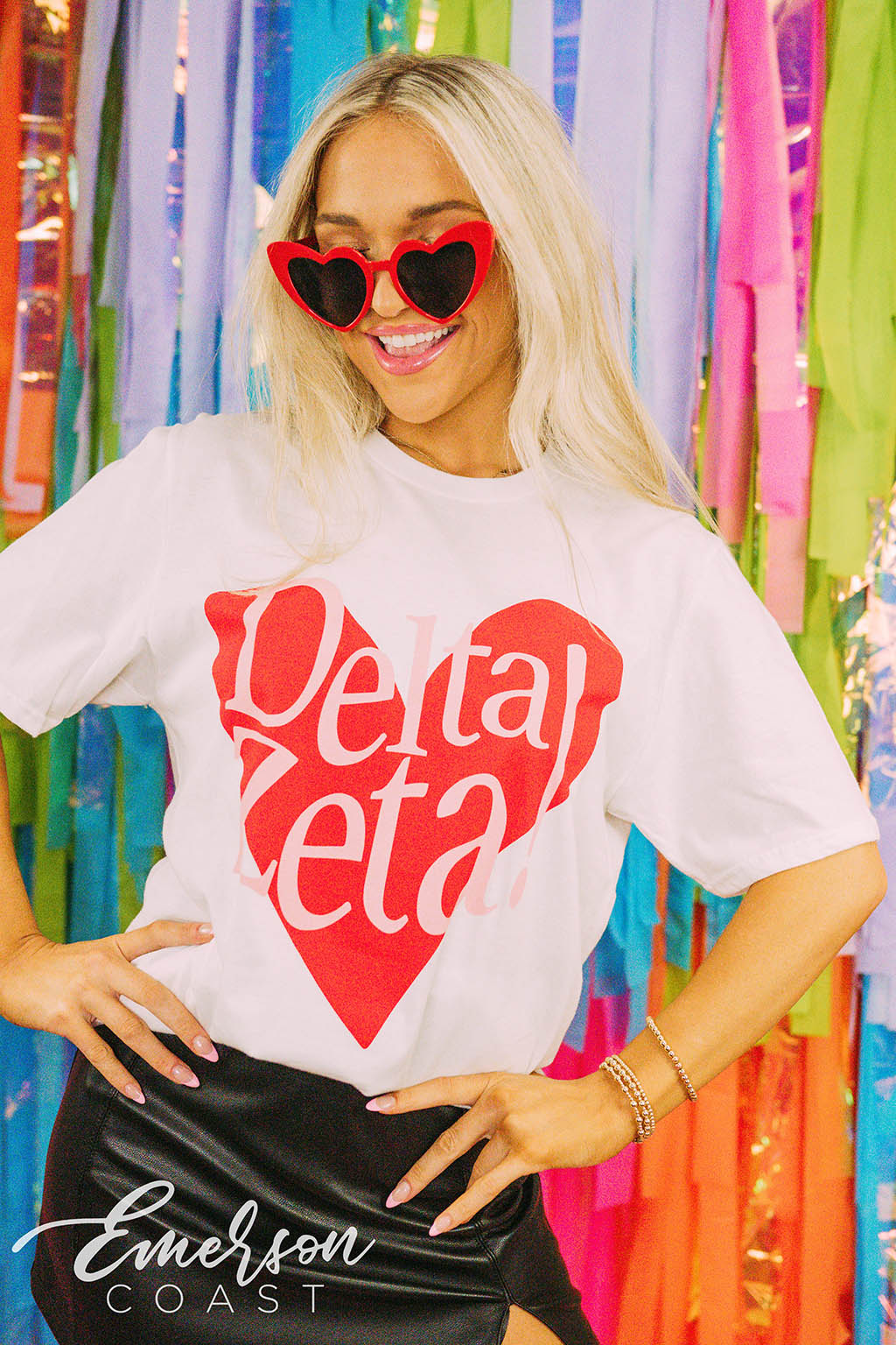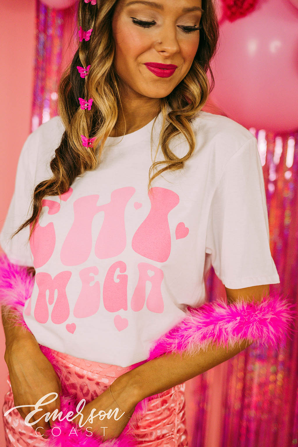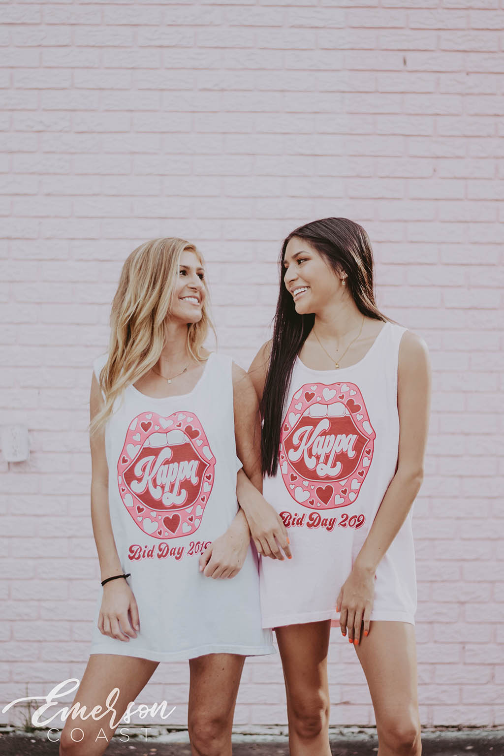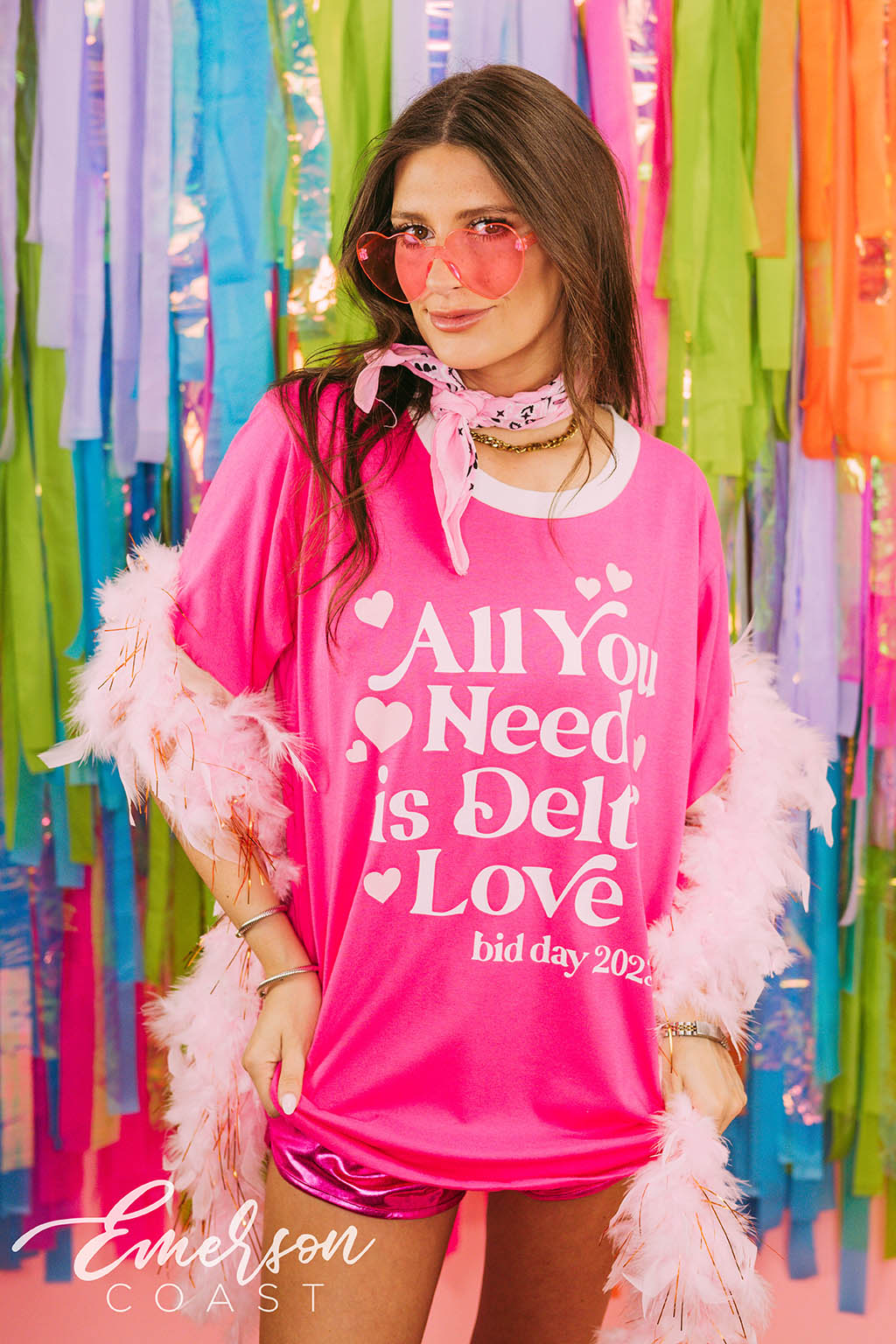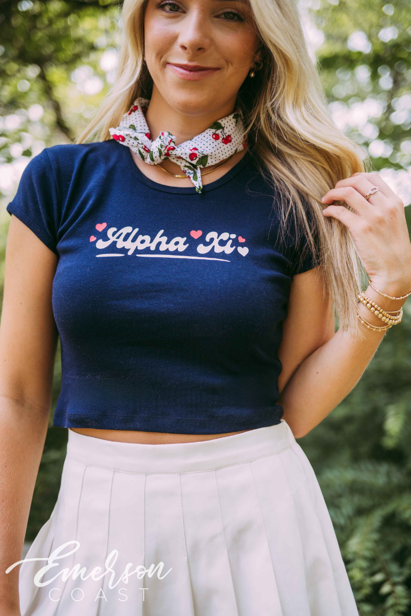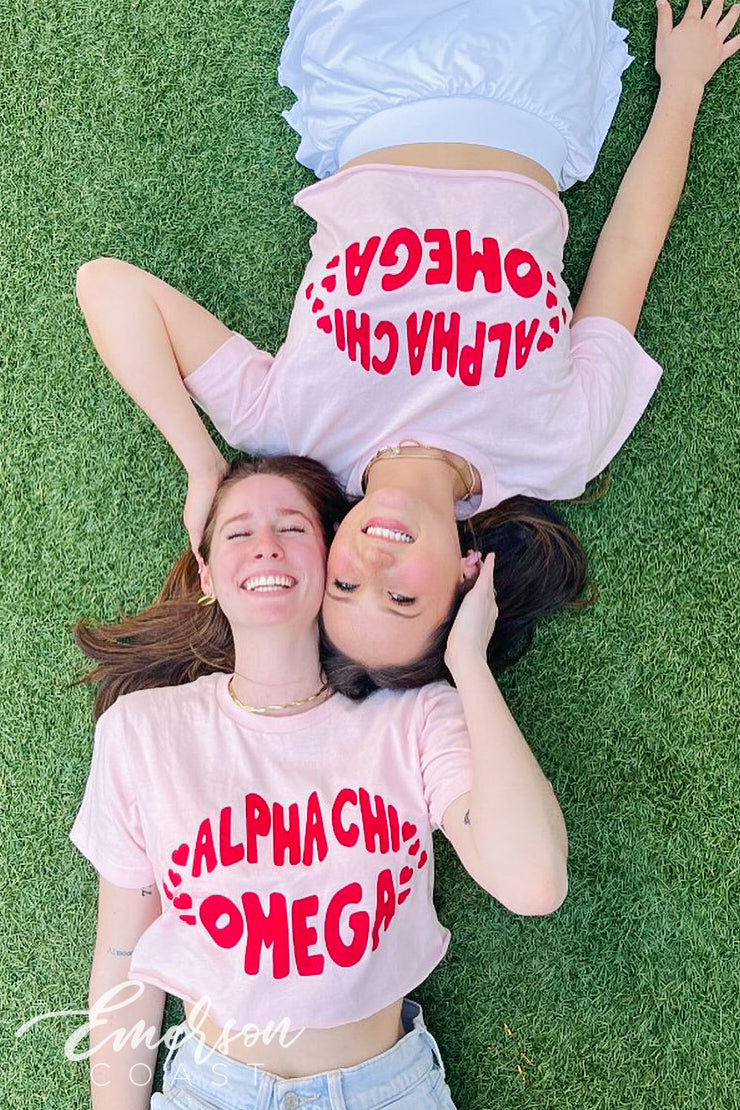 You can style each of these designs however you want! For the retro bid day tank, you can style your look with jeans or jean shorts, also add a pink cowboy hat to finish the look. With the white and pink lips tee, you can wear heart jewelry and heart sunglasses. Style your red and pink heart ringer tee with a leather skirt to dress it up or a pink cheer skirt to dress it down. Each of these tees are very different but they all can be worn tied up in the front or oversized depending on how your chapter wants to style it.