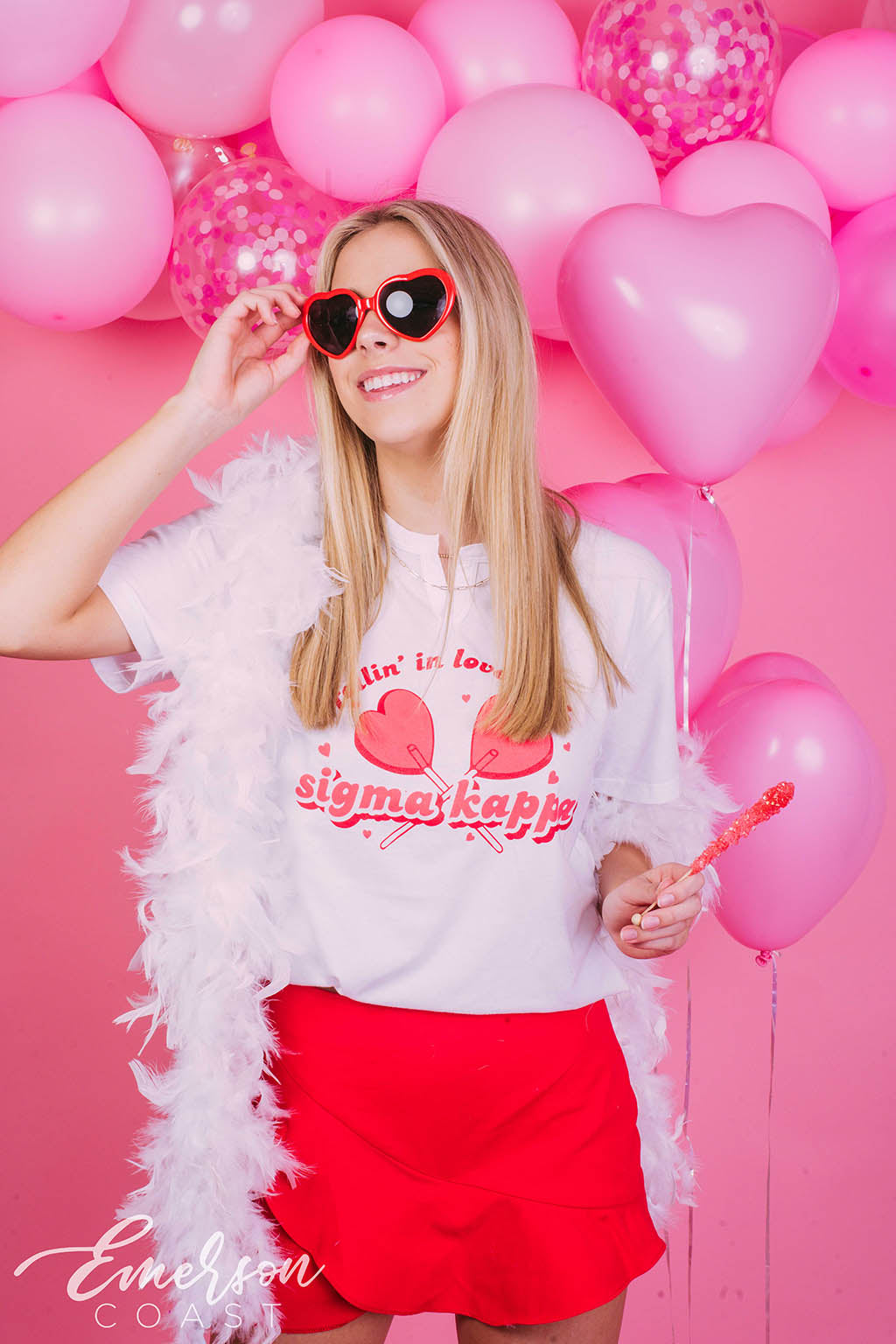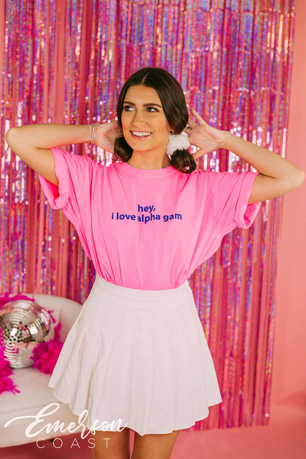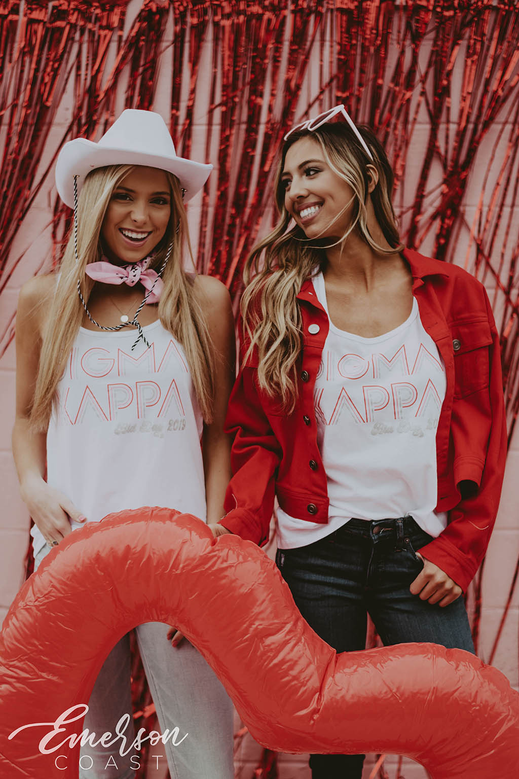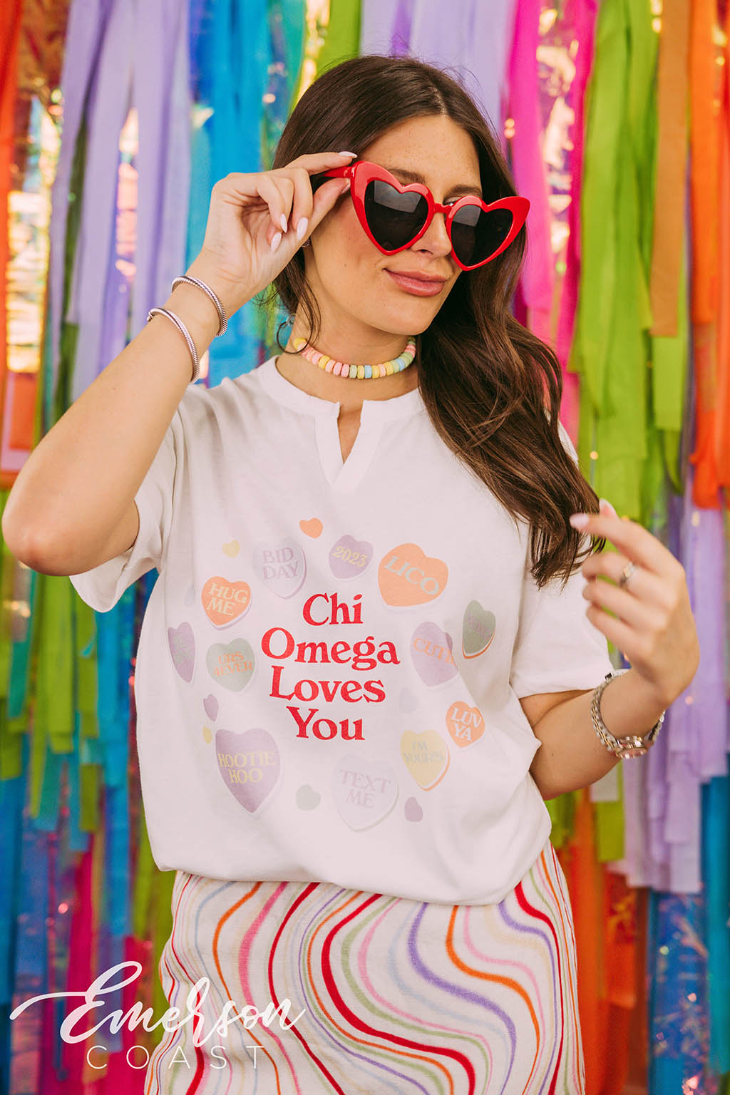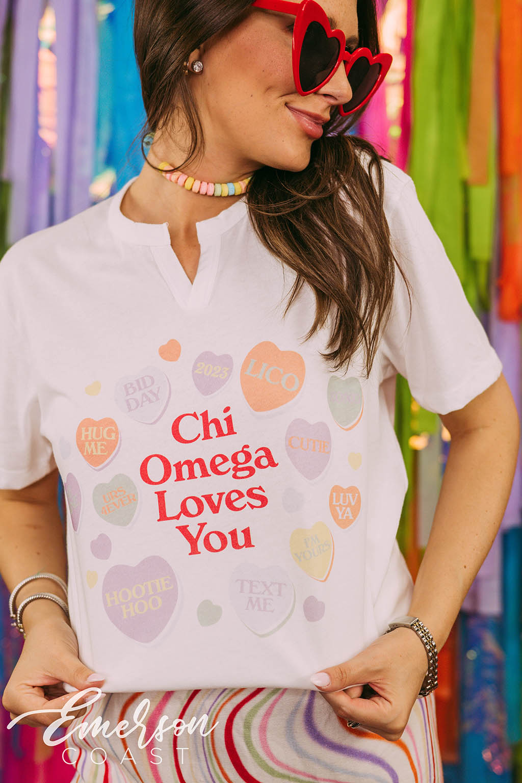 You can style each of these designs however you want! For the retro bid day tank, you can style your look with jeans or jean shorts, also add a pink cowboy hat to finish the look. With the white and pink lips tee, you can wear heart jewelry and heart sunglasses. Style your red and pink heart ringer tee with a leather skirt to dress it up or a pink cheer skirt to dress it down. Each of these tees are very different but they all can be worn tied up in the front or oversized depending on how your chapter wants to style it.