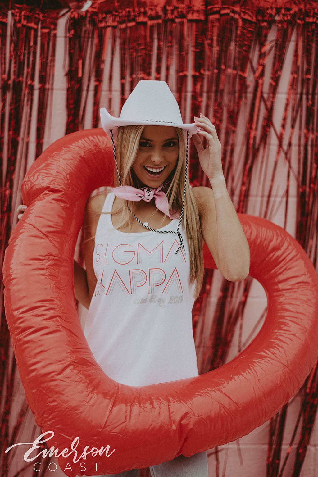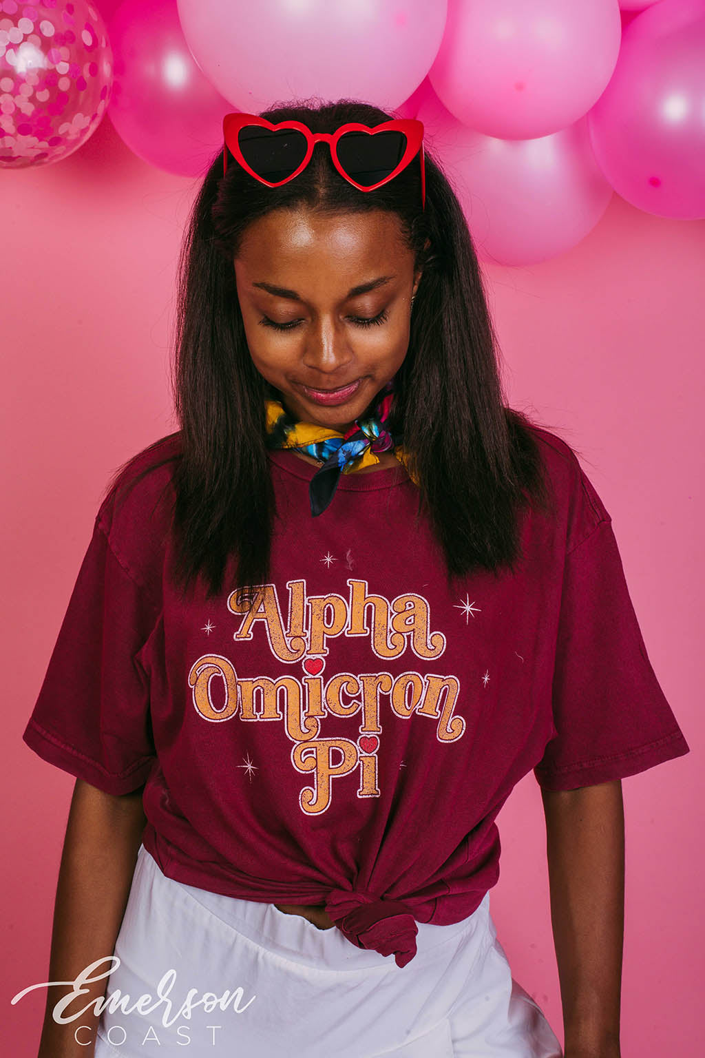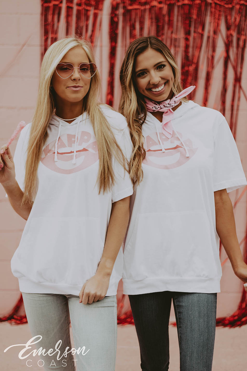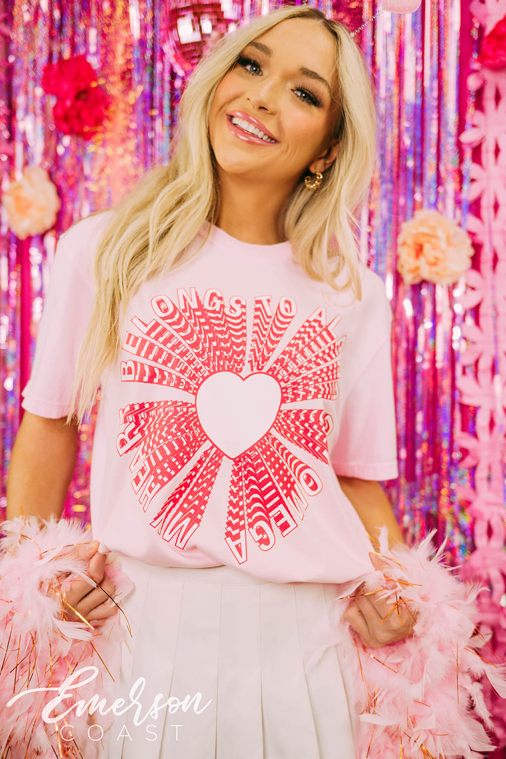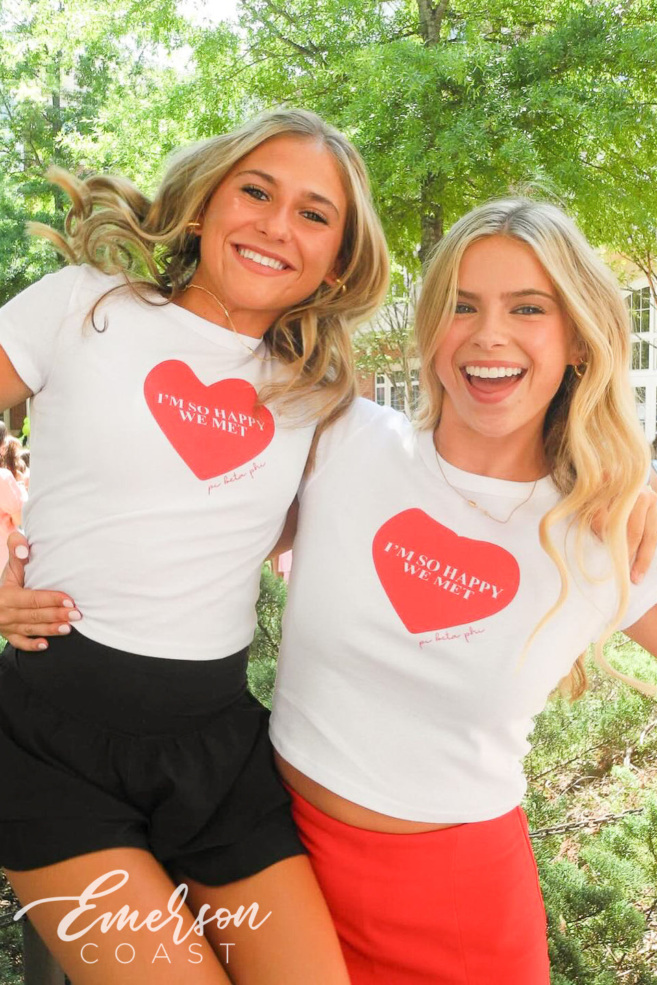 You can style each of these designs however you want! For the retro bid day tank, you can style your look with jeans or jean shorts, also add a pink cowboy hat to finish the look. With the white and pink lips tee, you can wear heart jewelry and heart sunglasses. Style your red and pink heart ringer tee with a leather skirt to dress it up or a pink cheer skirt to dress it down. Each of these tees are very different but they all can be worn tied up in the front or oversized depending on how your chapter wants to style it.