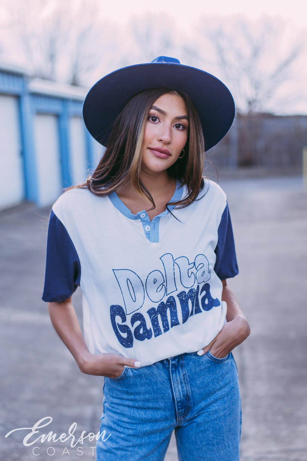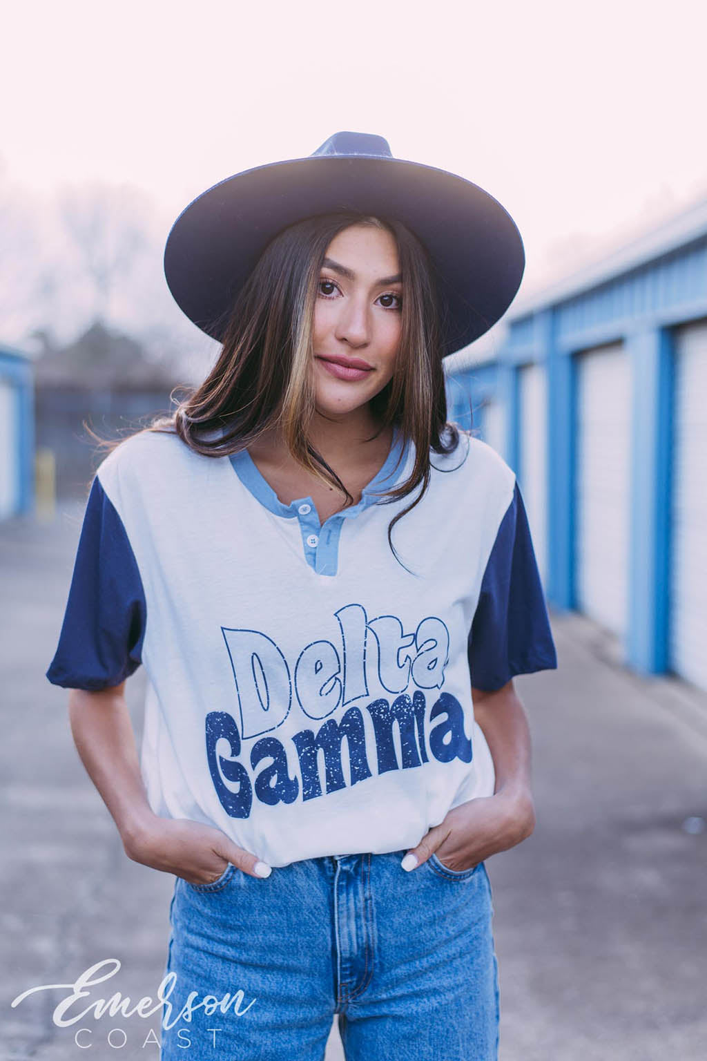 Be a pastel dream in the Delta Gamma Retro Colorblock Henley!