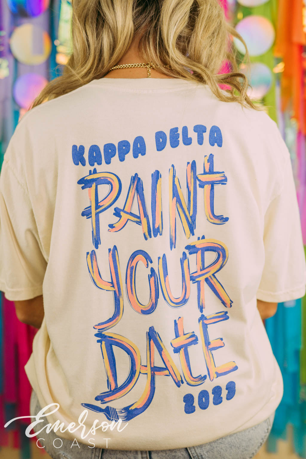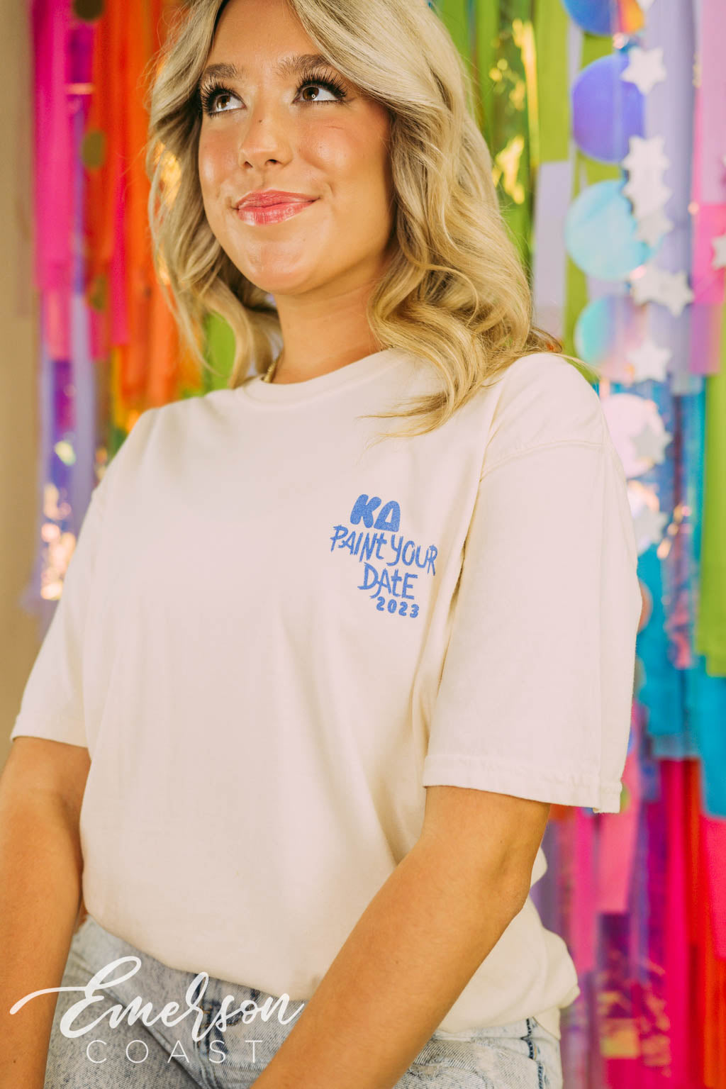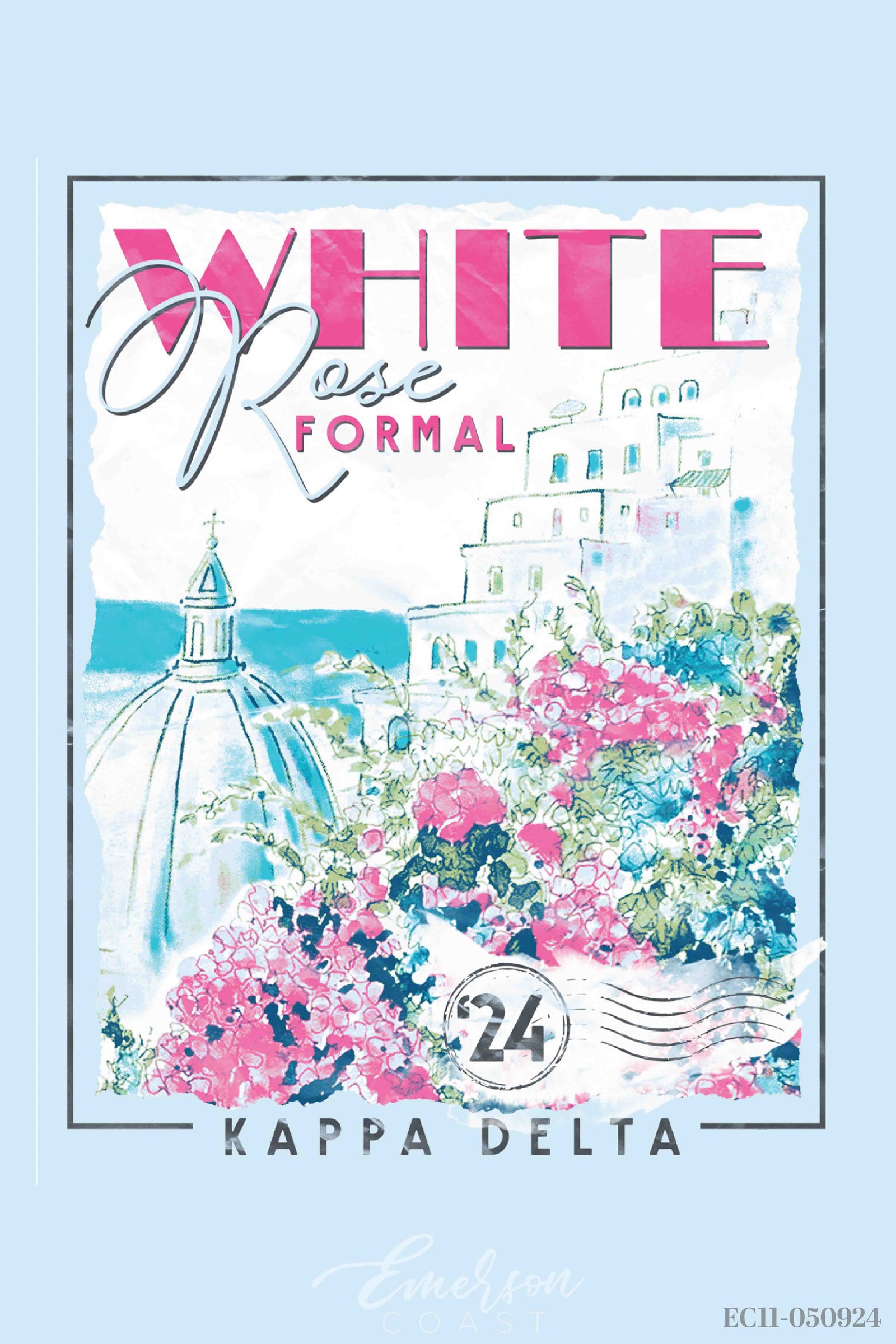 Tri Delta at Arkansas captured the magic of the Amalfi Coast for Bid Day with custom slouchy tees — white for members, cloud blue for new girls. Styled with flowy skirts and neck scarves, the whole vibe was straight out of a summer postcard.