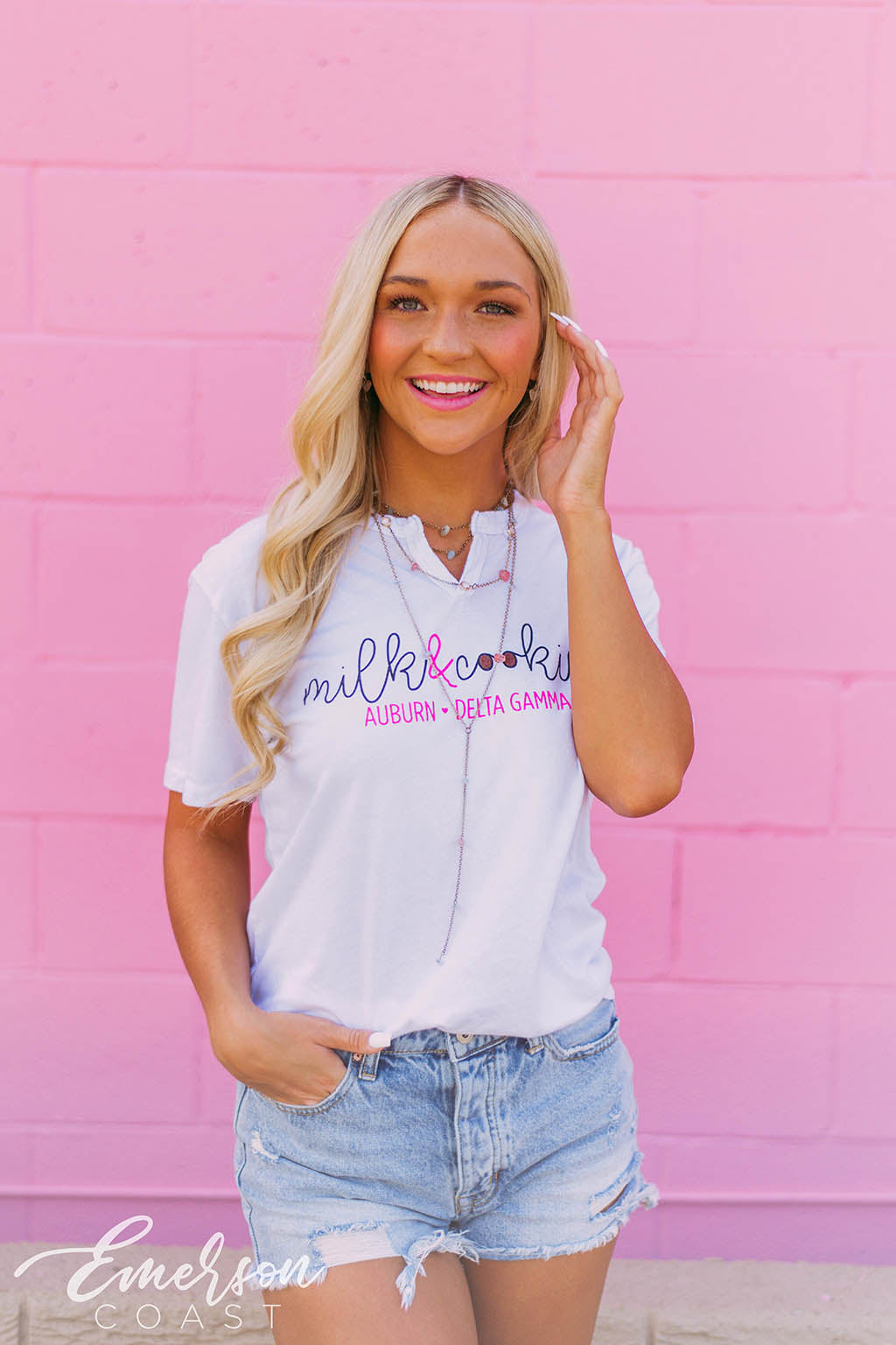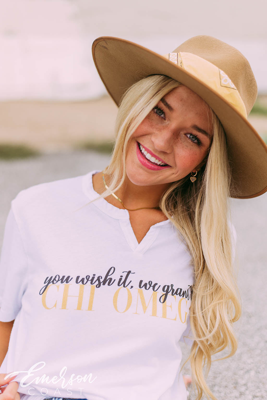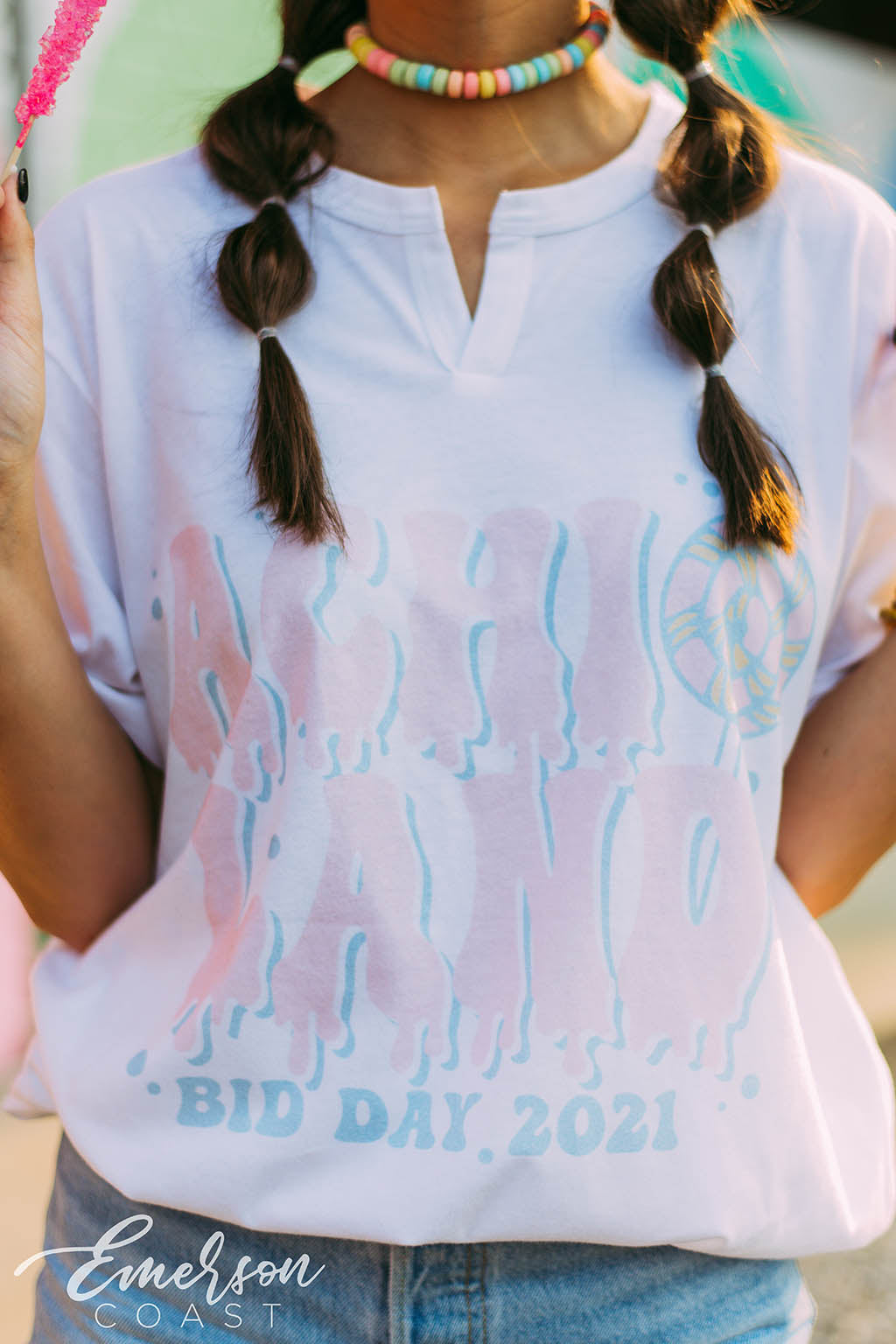 Tri Delta at Arkansas captured the magic of the Amalfi Coast for Bid Day with custom slouchy tees — white for members, cloud blue for new girls. Styled with flowy skirts and neck scarves, the whole vibe was straight out of a summer postcard.