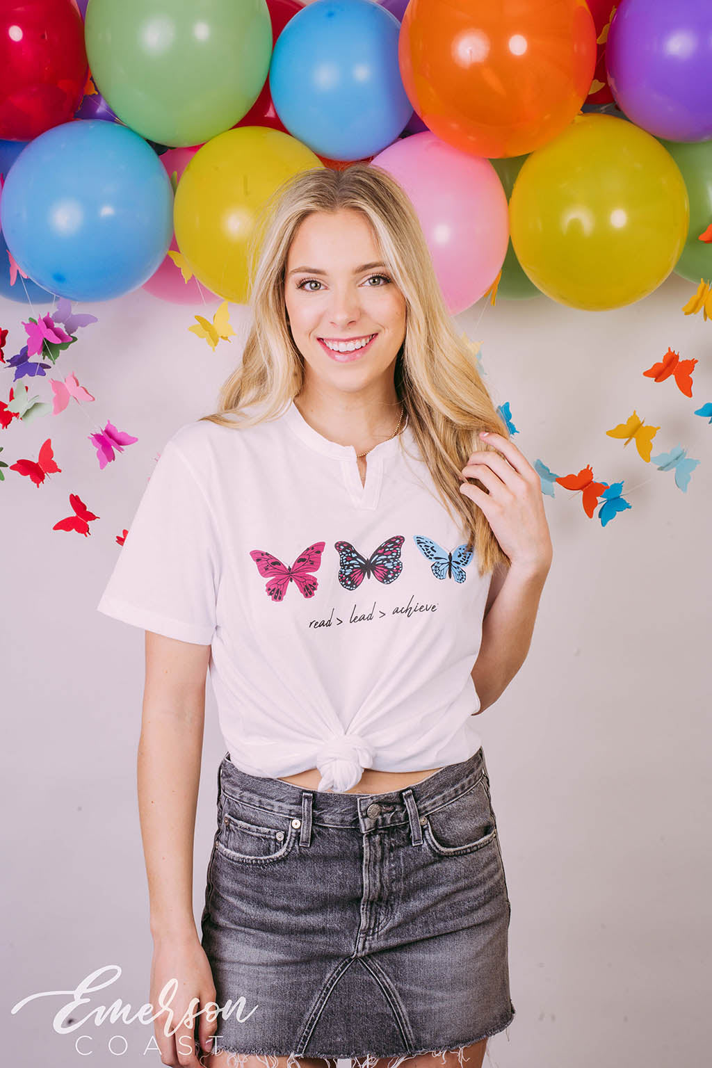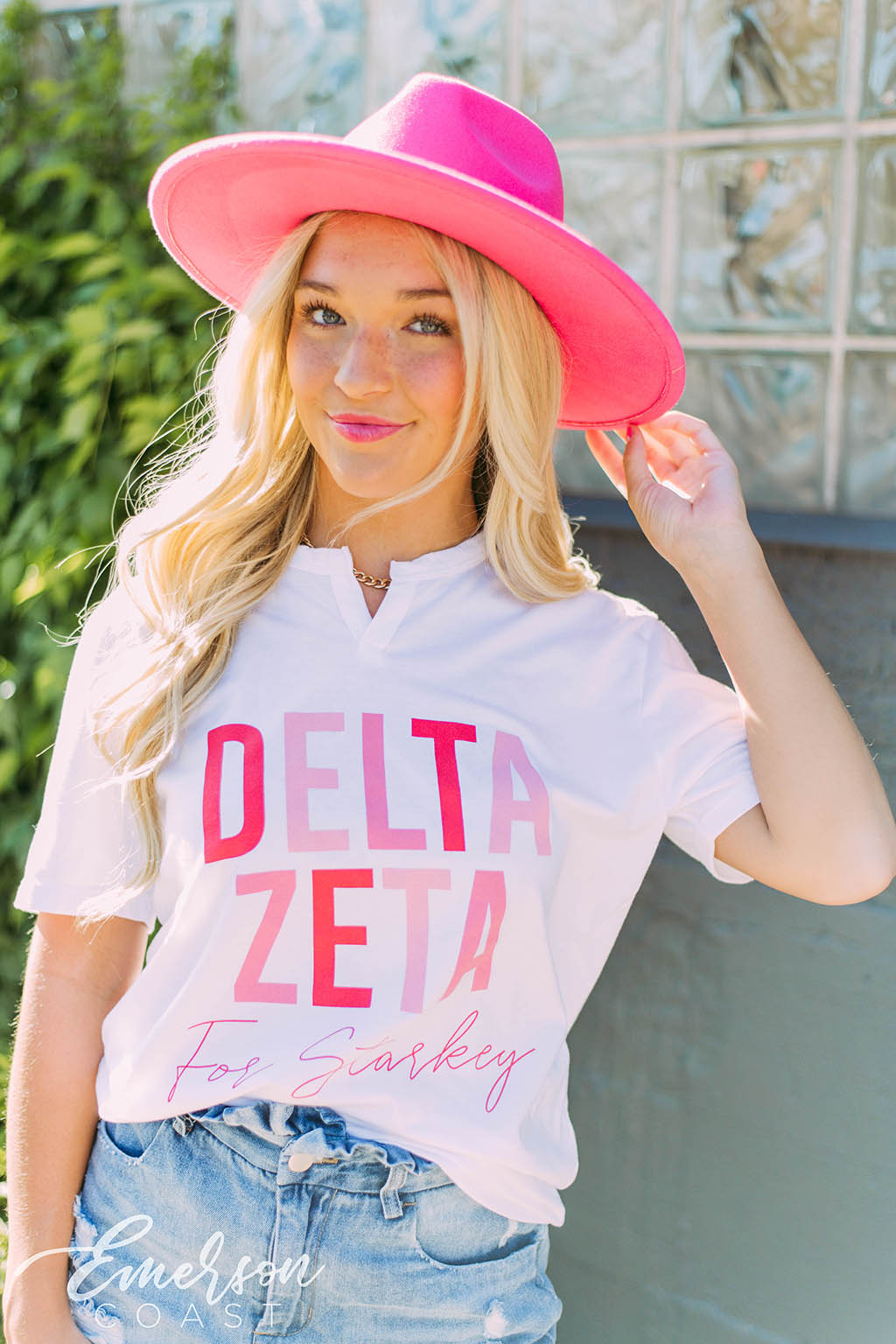Gamma Phi at Oklahoma State floated into Bid Day with the dreamiest hot air balloon theme and the cutest pink colorblock ringer tees! Featuring soft pastel Greek letters, these tops added a fun pop of retro charm to an already magical day.