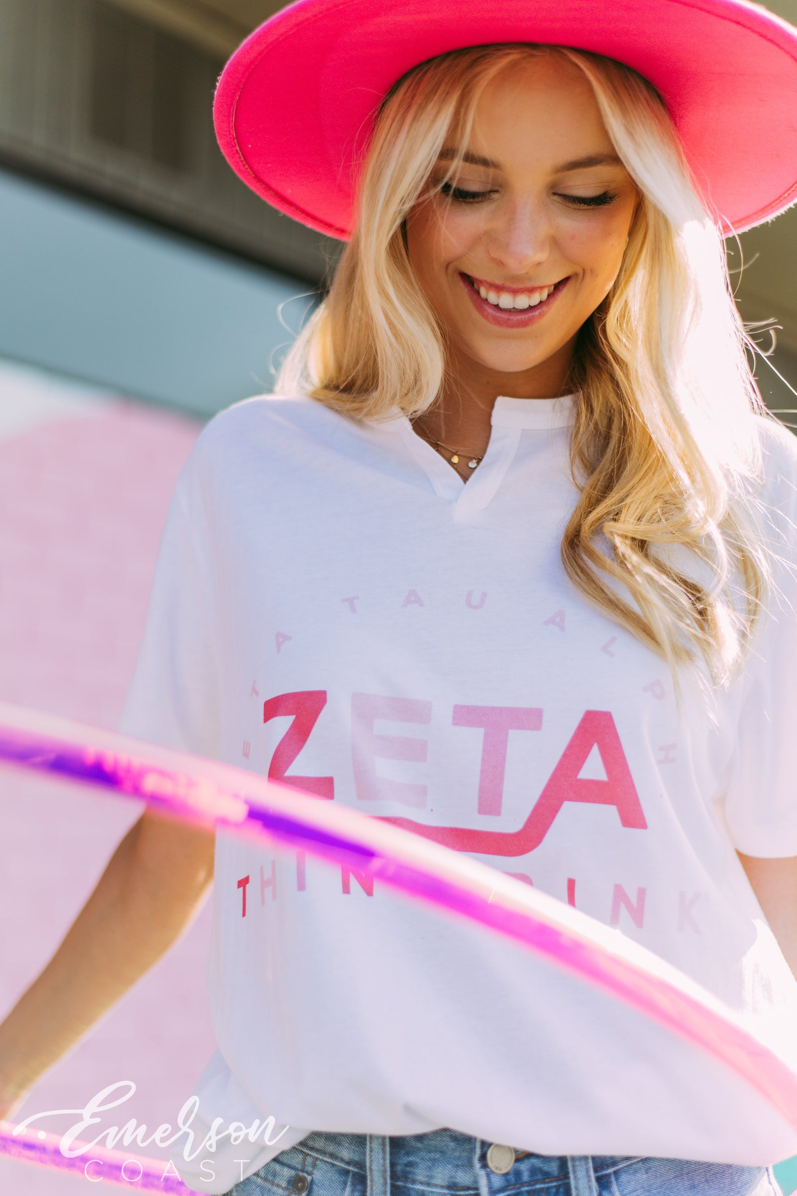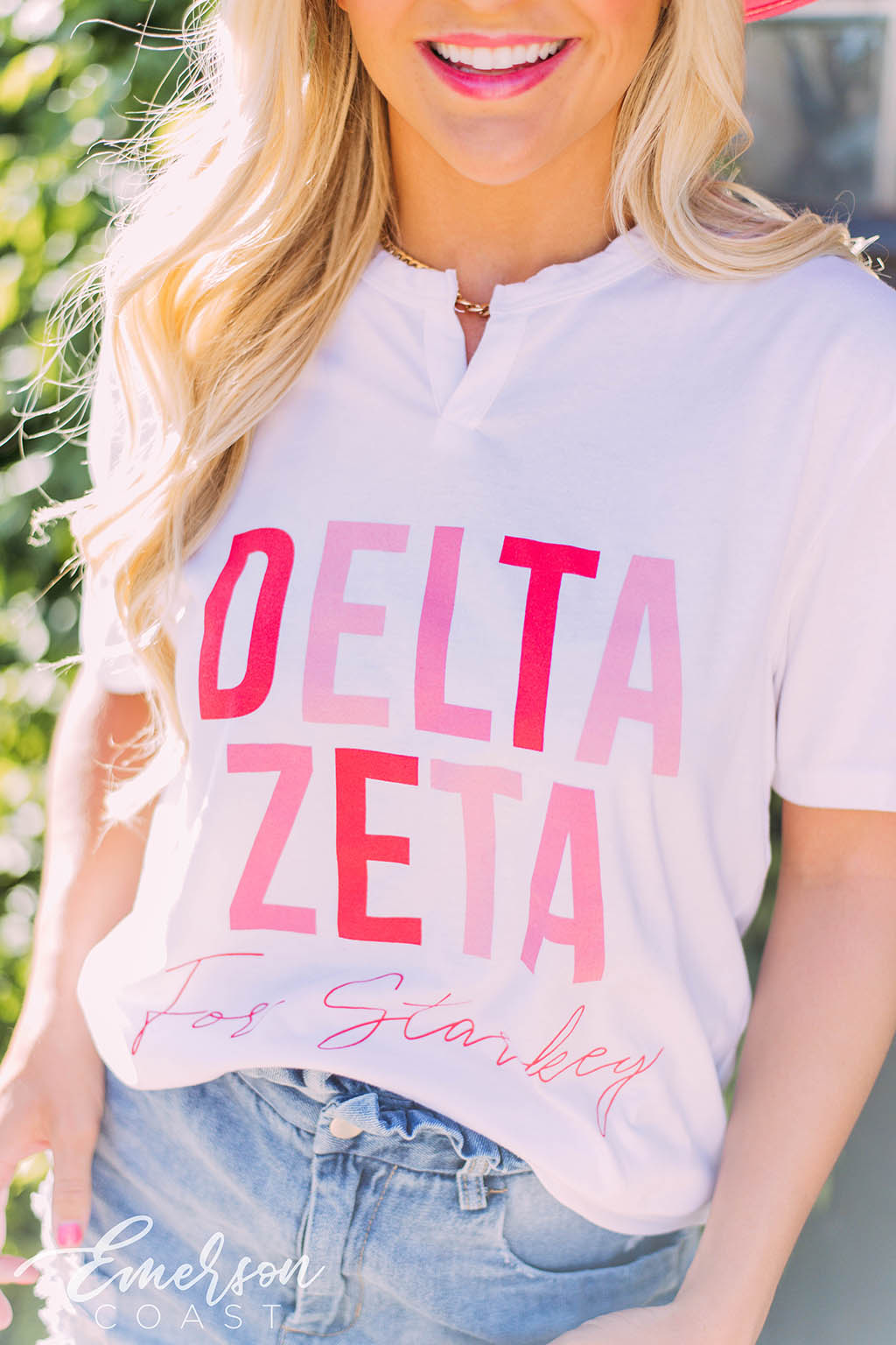 ZTA at Georgia Tech rocked custom teal slouchy tees for Recruitment, pairing them with white denim for a clean, polished look. The bold color choice made a statement while keeping things fun, fresh, and totally on brand.