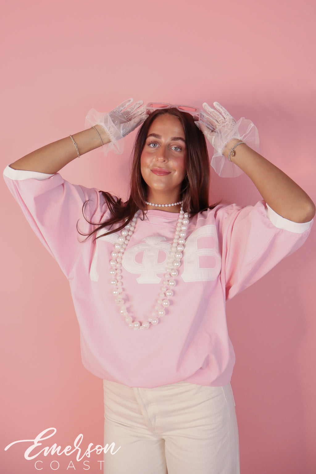 Celebrate your sisterhood with the Delta Zeta Patchwork Letter Bid Day T-Shirt! This charming tee features a delightful patchwork design, combining gingham and textured elements that perfectly capture the spirit of your sorority. Customize it to reflect your unique style and make it a standout piece for Bid Day!