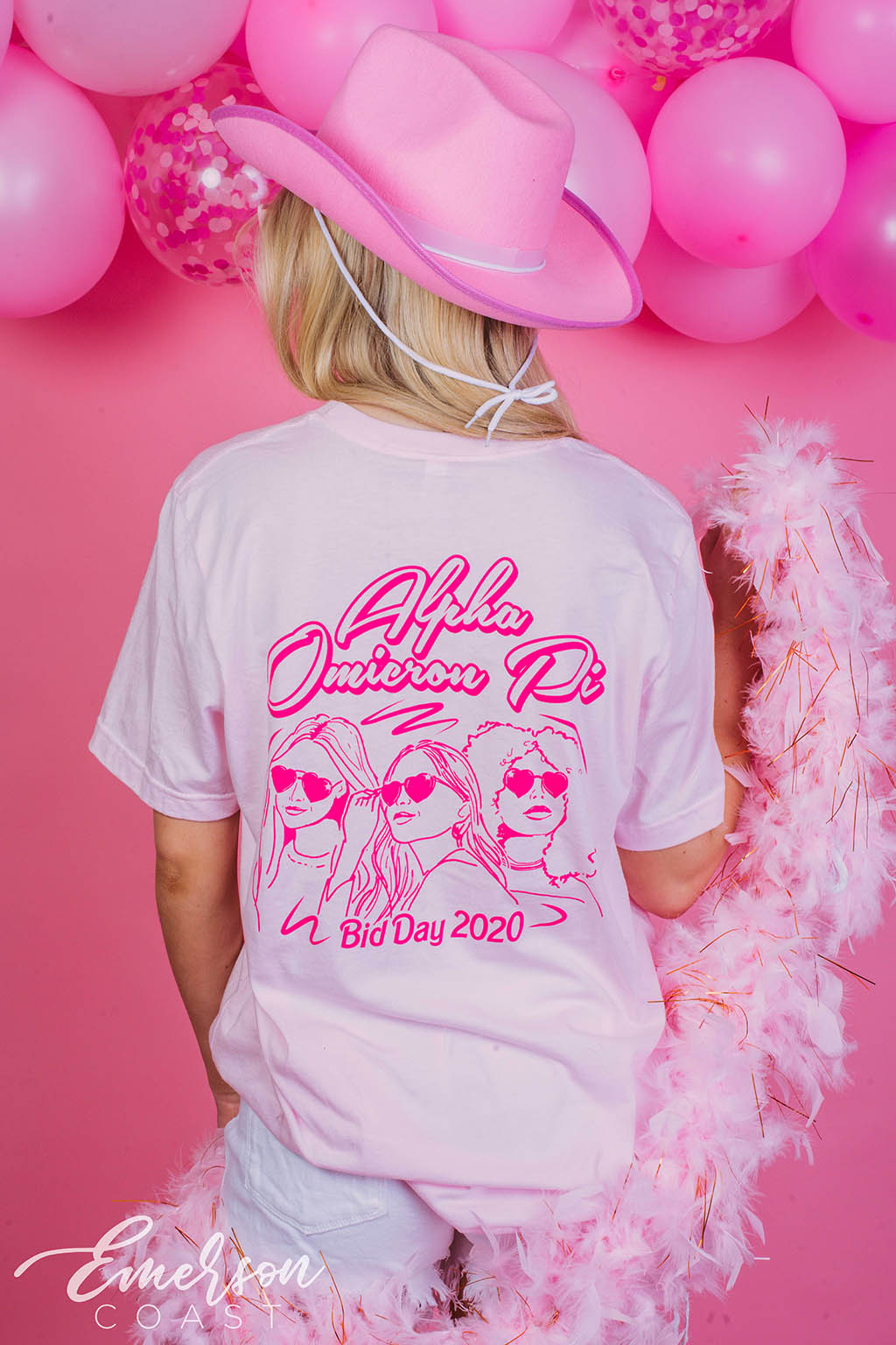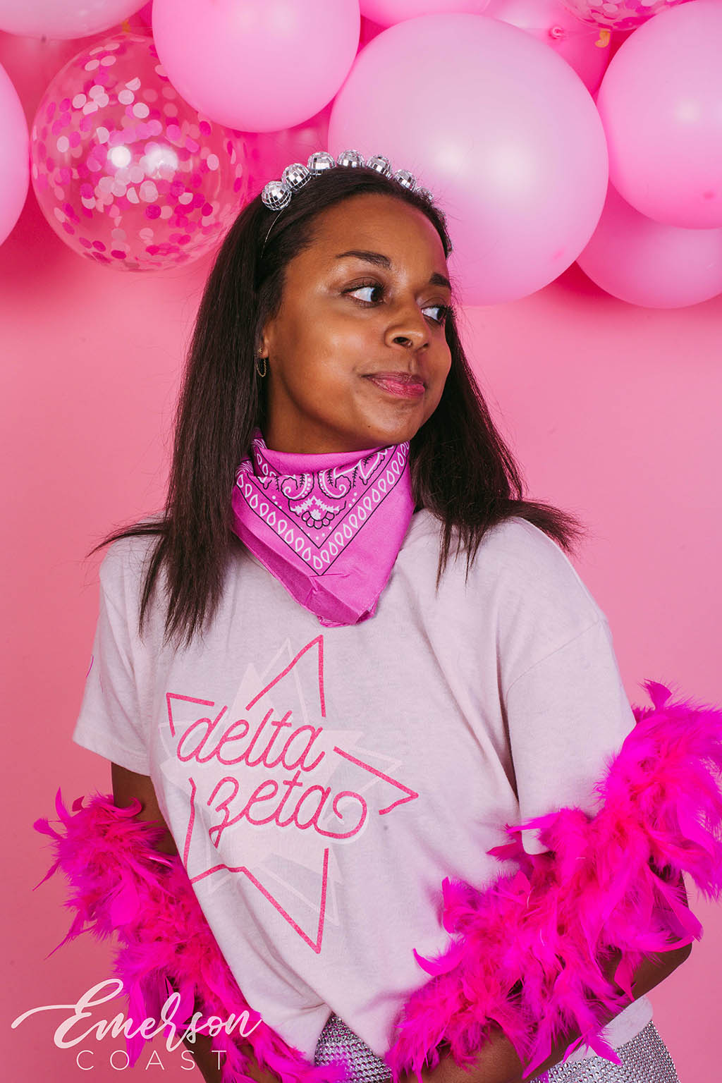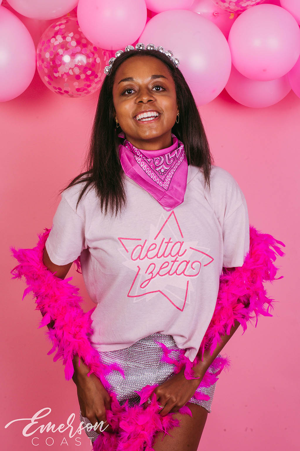 Gamma Phi at Oklahoma State floated into Bid Day with the dreamiest hot air balloon theme and the cutest pink colorblock ringer tees! Featuring soft pastel Greek letters, these tops added a fun pop of retro charm to an already magical day.
