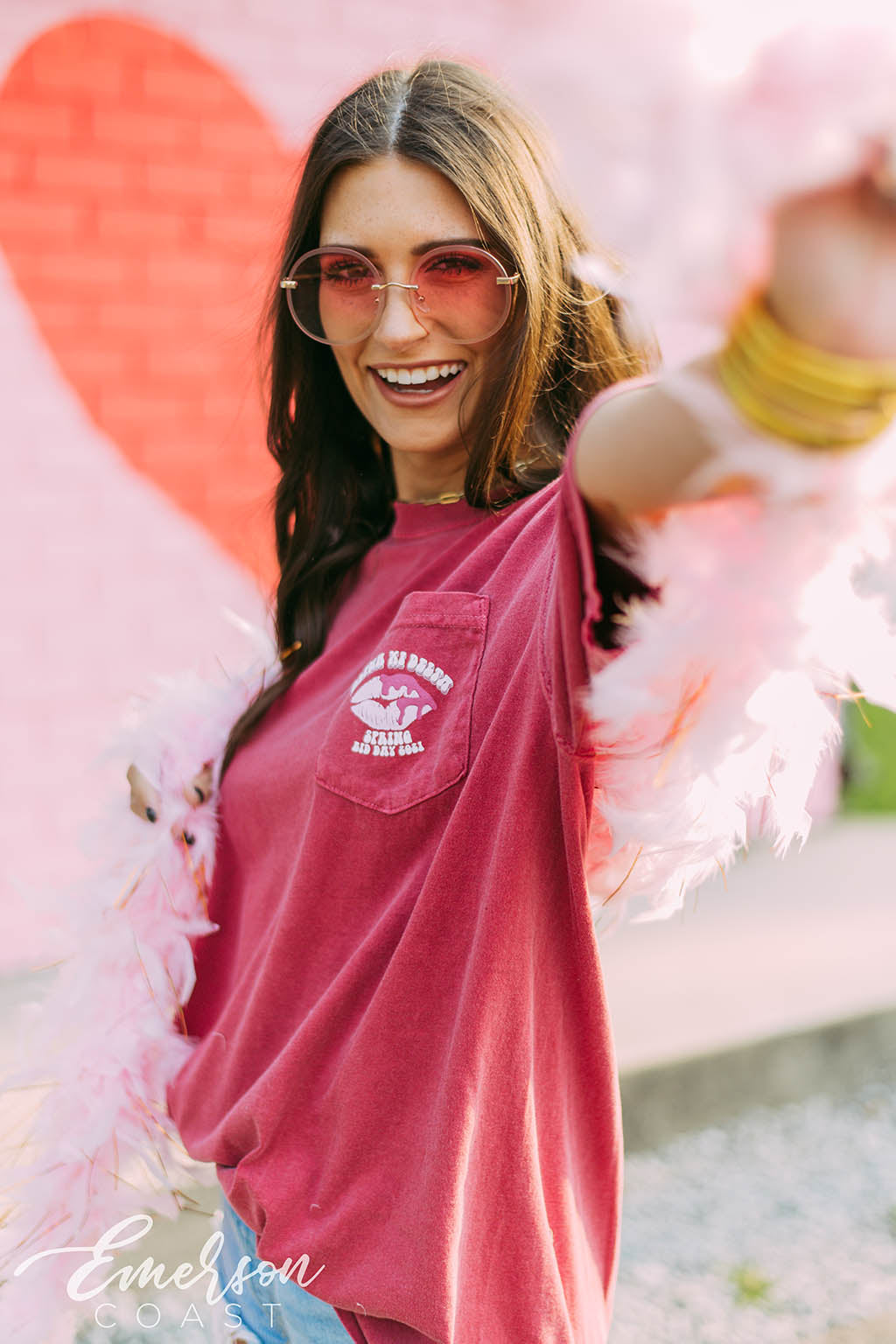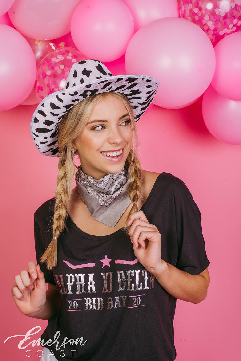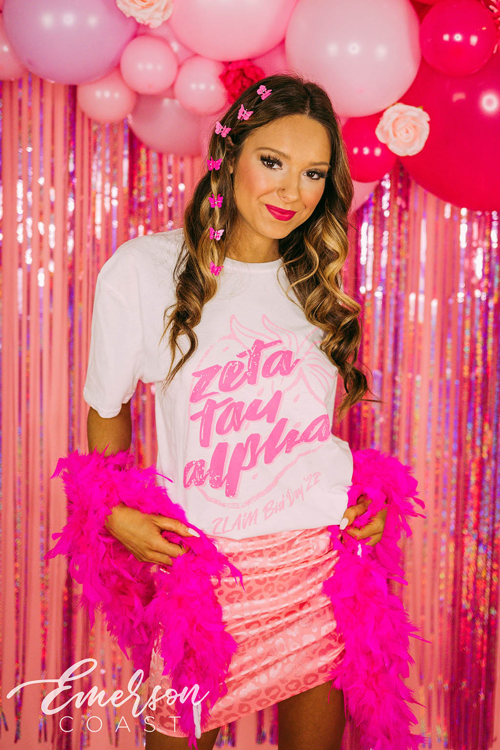 Gamma Phi at Oklahoma State floated into Bid Day with the dreamiest hot air balloon theme and the cutest pink colorblock ringer tees! Featuring soft pastel Greek letters, these tops added a fun pop of retro charm to an already magical day.