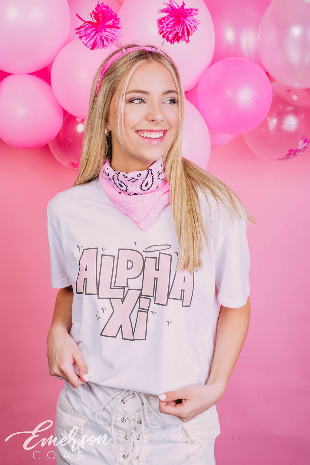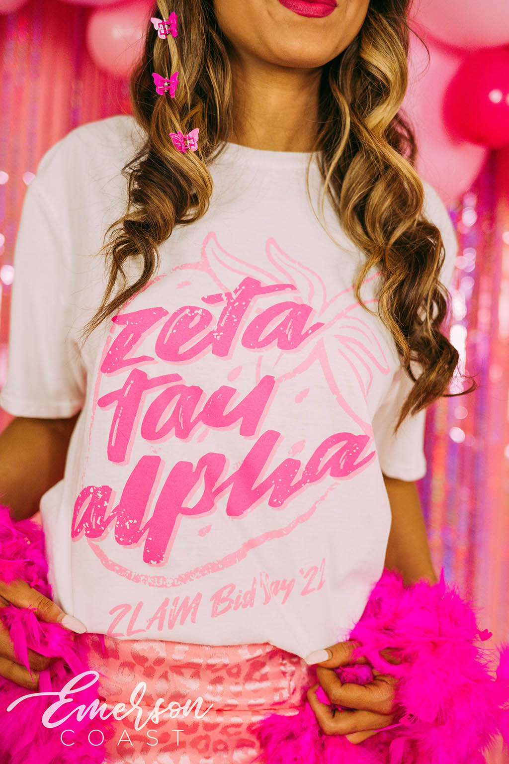 Tri Delta at Arkansas captured the magic of the Amalfi Coast for Bid Day with custom slouchy tees — white for members, cloud blue for new girls. Styled with flowy skirts and neck scarves, the whole vibe was straight out of a summer postcard.