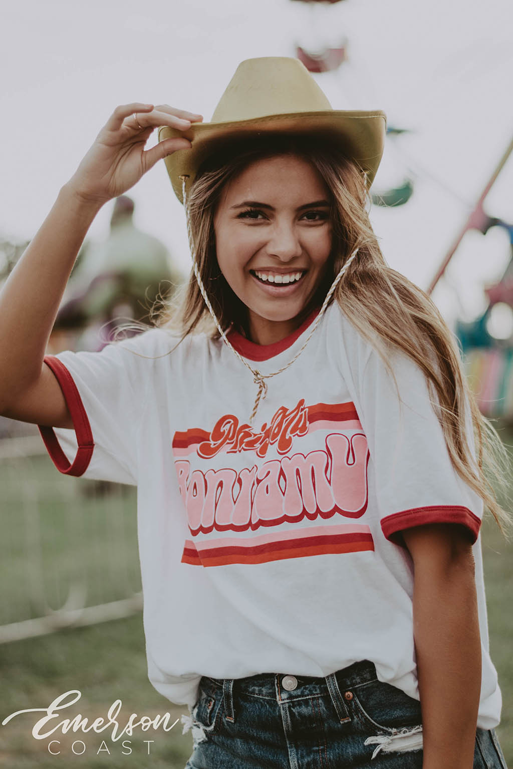 Pi Phi at Auburn made hearts melt with their white baby tees for Bid Day, featuring a sweet red heart and the phrase “I’m so happy we met.” A perfect, feel-good look to kick off sisterhood with major charm.