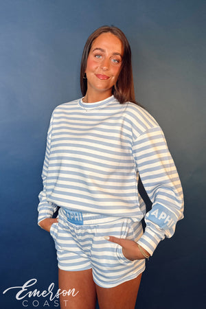 Model is 5'8" wearing a size L crewneck and size S shorts
