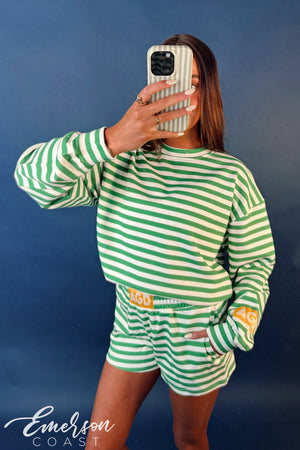 Model is 5'5" wearing a size L crewneck and size L shorts