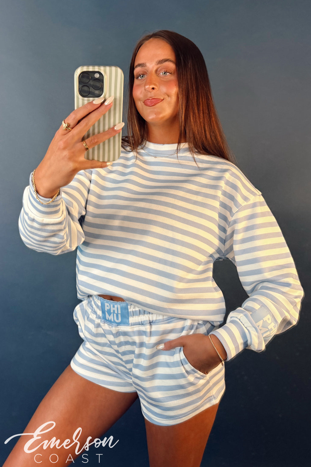 Model is 5'5" wearing a size M crewneck and size M shorts