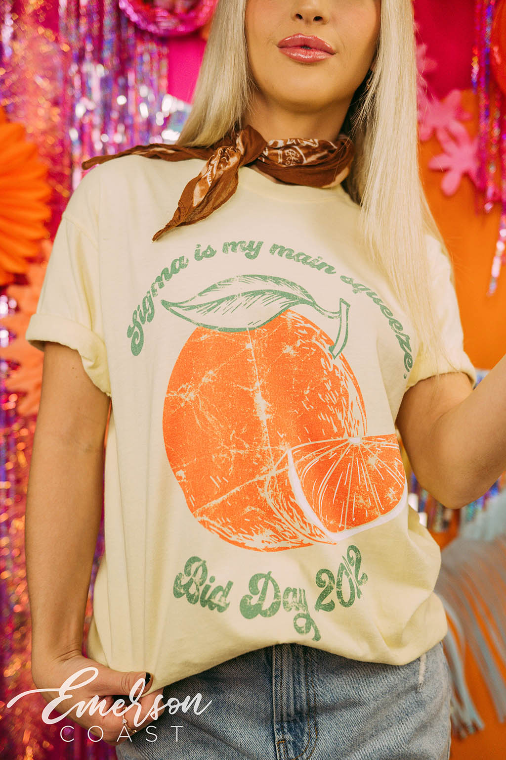 Tri Delta at Arkansas captured the magic of the Amalfi Coast for Bid Day with custom slouchy tees — white for members, cloud blue for new girls. Styled with flowy skirts and neck scarves, the whole vibe was straight out of a summer postcard.