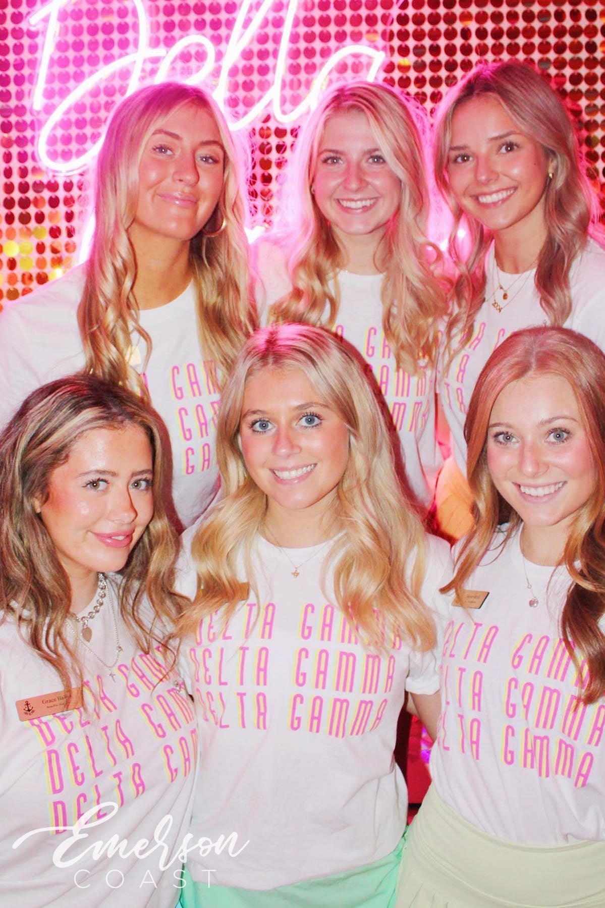 Tri Delta at Arkansas captured the magic of the Amalfi Coast for Bid Day with custom slouchy tees — white for members, cloud blue for new girls. Styled with flowy skirts and neck scarves, the whole vibe was straight out of a summer postcard.