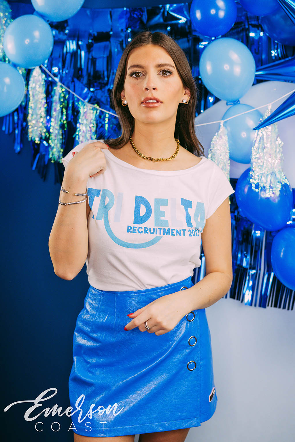 This rocker tee is the perfect shirt to look effortlessly cool. The distressed look adds a vintage or edgy twist to all of your sorority shirts. This shirt is so versatile and is perfect from anything between recruitment to PR.