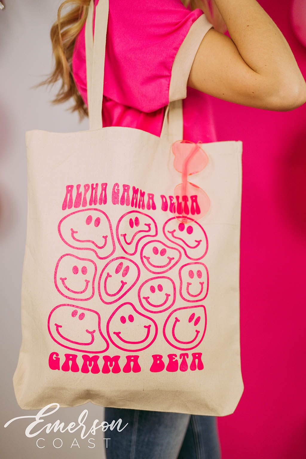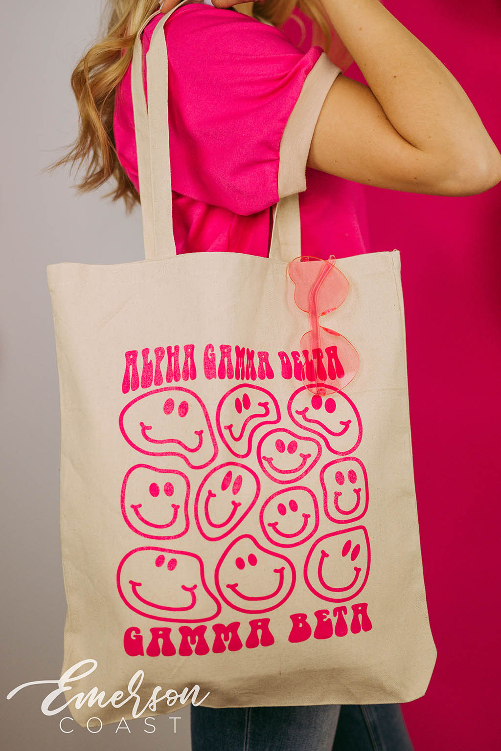 Be happy with the Alpha Gamma Delta Smiley Tote Bag!