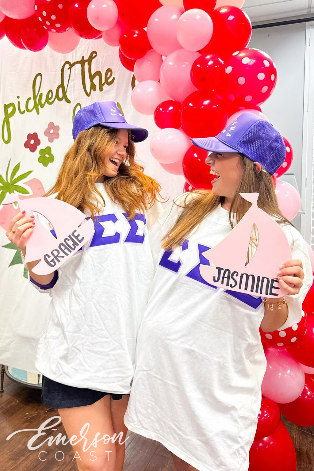 Pi Phi at Auburn made hearts melt with their white baby tees for Bid Day, featuring a sweet red heart and the phrase “I’m so happy we met.” A perfect, feel-good look to kick off sisterhood with major charm.
