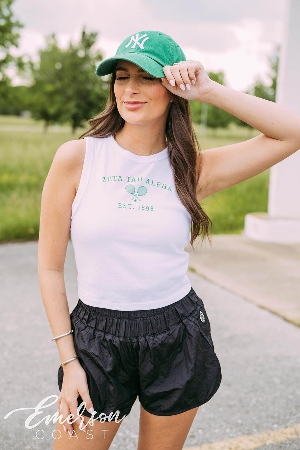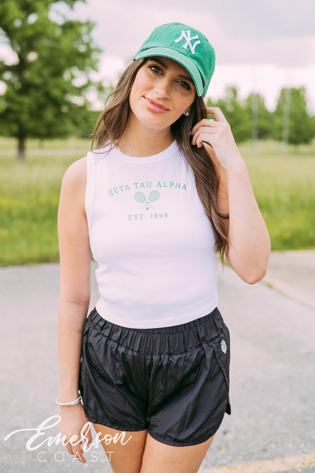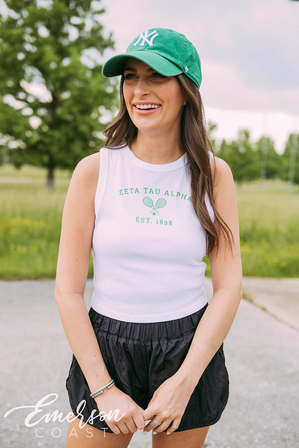 You're going to love our Zeta Tennis Baby Tank! Whether you're a Zeta Tau Alpha or just love tennis, this tank is perfect for all occasions. Not only is the white shade classic and timeless, but the vibrant green font adds a beautiful, eye-catching contrast. Two cute little tennis racquets and a tennis ball are pictured in the center, making the design modern, yet still totally trendy. This tank is so simple but so eye-catching, and it's sure to be the hit of your sorority. We know your t-shirt chairs will be happy to add it to the selection!